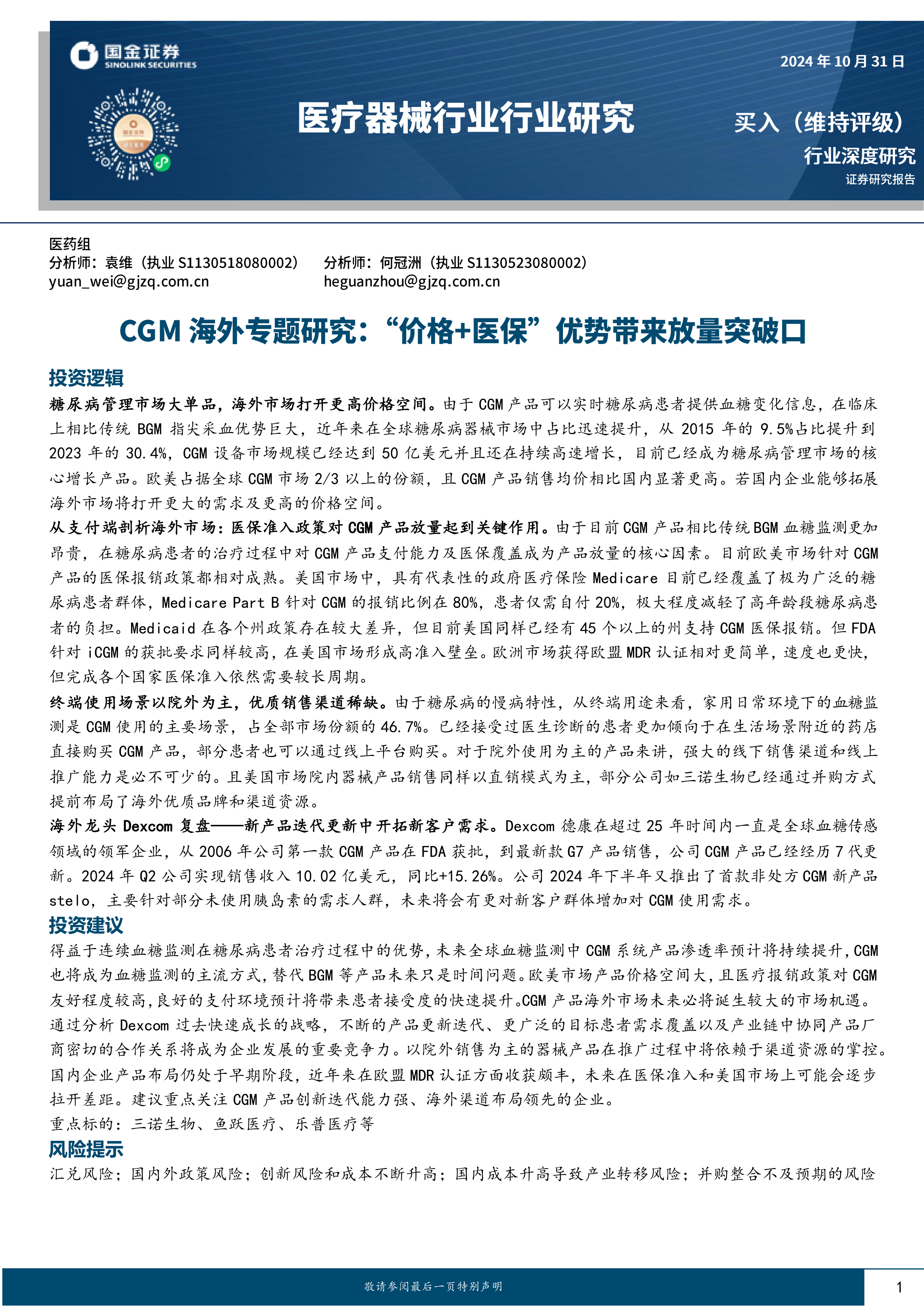 得益于连续血糖监测在糖尿病患者治疗过程中的优势,未来全球血糖监测中CGM系统产品渗透率预计将持续提升,CGM也将成为血糖监测的主流方式,替代BGM等产品未来只是时间问题。欧美市场产品价格空间大,且医疗报销政策对CGM友好程度较高,良好的支付环境预计将带来患者接受度的快速提升。CGM产品海外市场未来必将诞生较大的市场机遇。通过分析Dexcom过去快速成长的战略,不断的产品更新迭代、更广泛的目标患者需求覆盖以及产业链中协同产品厂商密切的合作关系将成为企业发展的重要竞争力。以院外销售为主的器械产品在推广过程中将依赖于渠道资源的掌控。国内企业产品布局仍处于早期阶段,近年来在欧盟MDR认证方面收获颇丰,未来在医保准入和美国市场上可能会逐步拉开差距。建议重点关注CGM产品创新迭代能力强、海外渠道布局领先的企业。