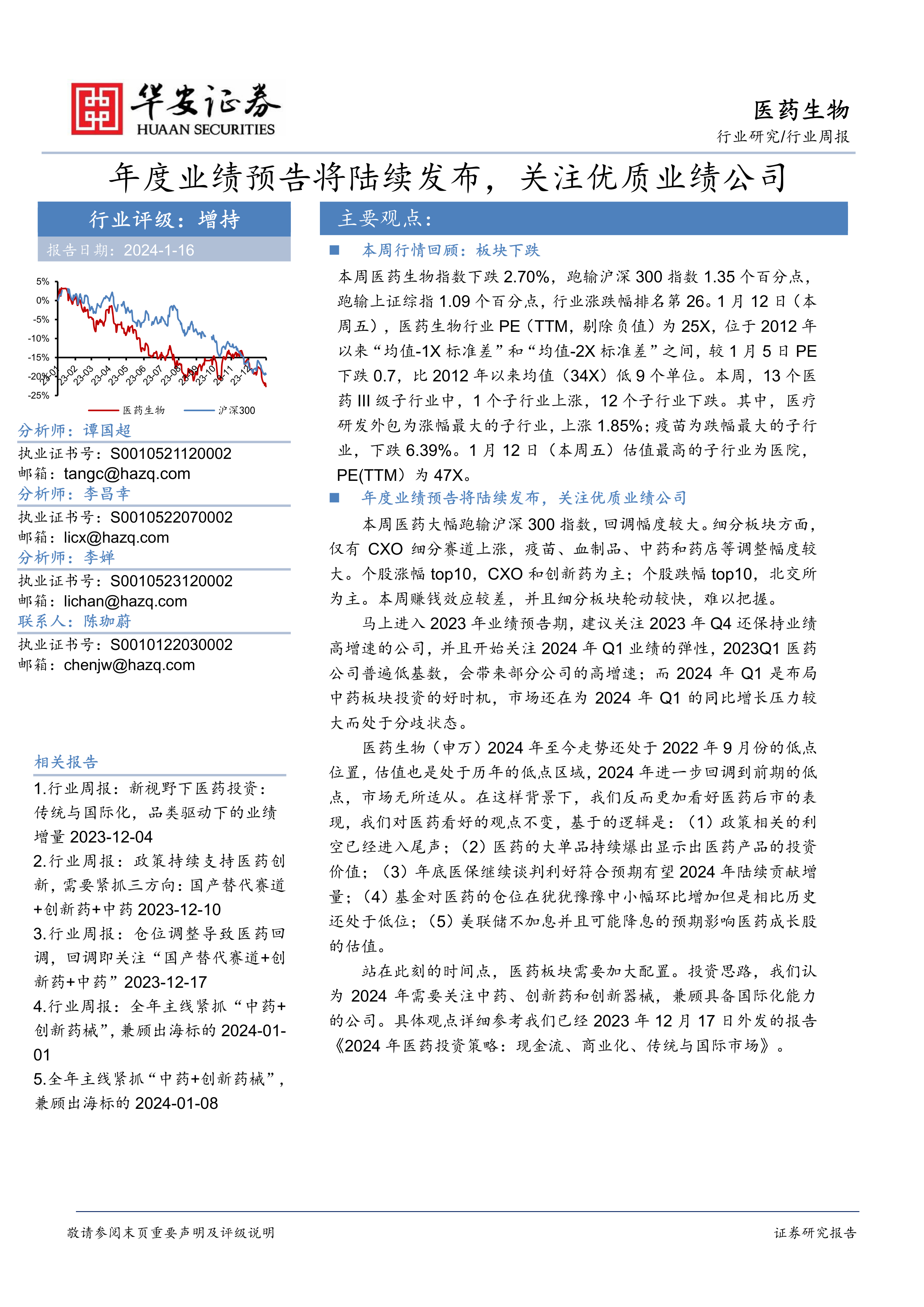 鉴于2023年年度业绩预告即将陆续发布,我们建议投资者关注2023年Q4业绩保持高增速的公司,并提前布局2024年Q1业绩弹性较大的公司,特别是中药板块。 我们认为,政策利空逐渐消退,大单品持续涌现,医保谈判利好,以及美联储可能降息等因素,都将利好医药行业长期发展。