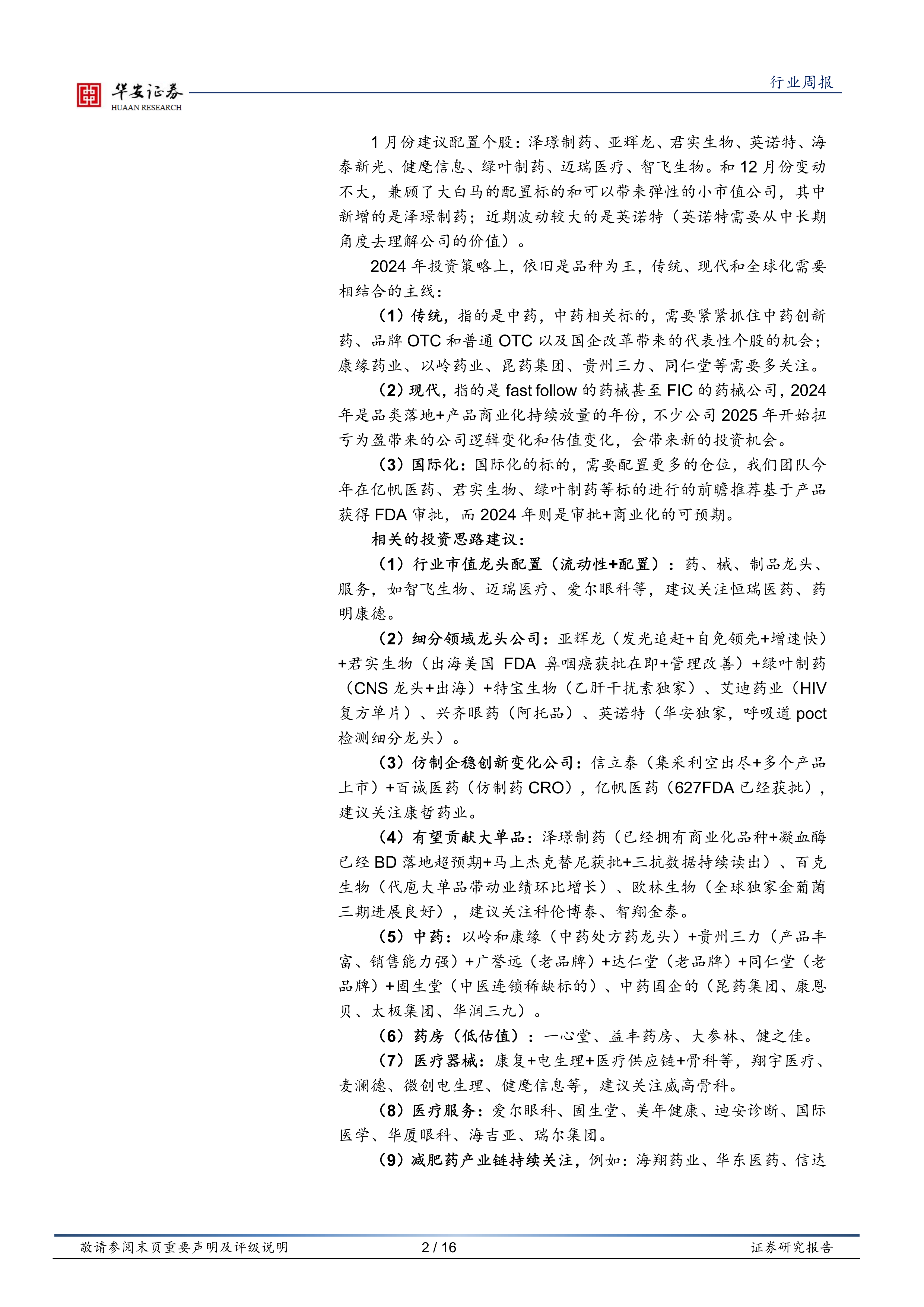 2023年Q4业绩及2024年Q1业绩弹性将成为市场关注焦点。我们建议关注2023年Q4保持高增速的公司,并认为2024年Q1是布局中药板块的良好时机。 长期投资策略上,我们建议关注中药、创新药和创新器械,以及具备国际化能力的公司。 报告中推荐了多个具体个股,涵盖了不同细分领域,例如:泽璟制药、亚辉龙、君实生物、英诺特、海泰新光、健麾信息、绿叶制药、迈瑞医疗、智飞生物等。 这些推荐考虑了公司规模、增长潜力和国际化程度等因素。