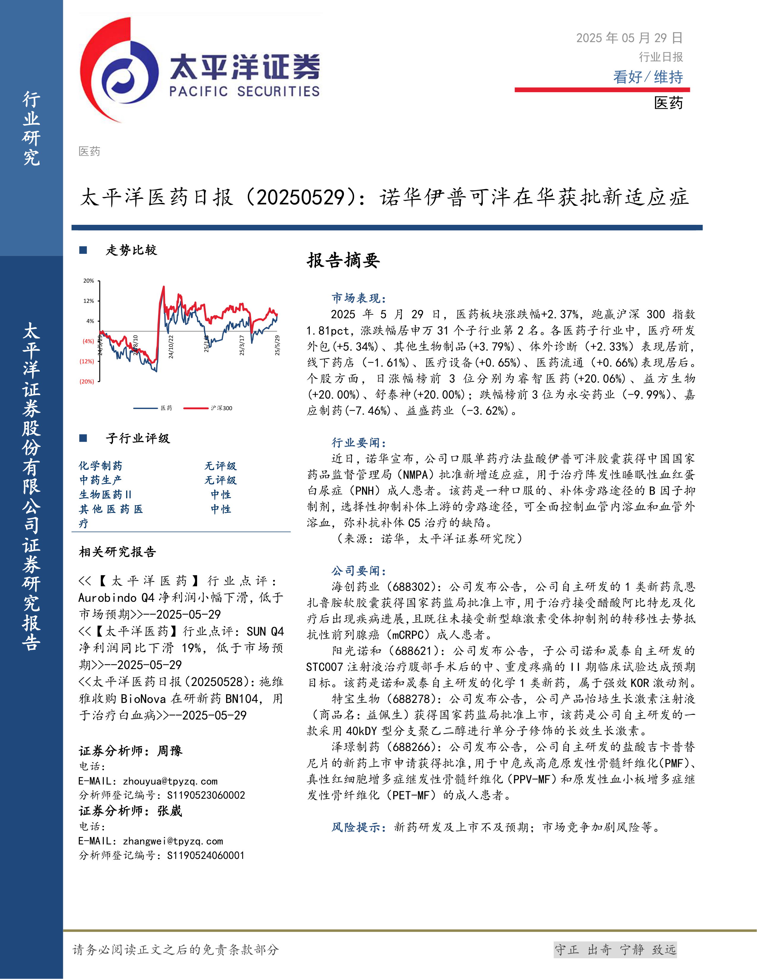 本报告的核心观点是:2025年5月29日,医药板块整体表现强劲,跑赢沪深300指数,多个子行业表现突出,部分个股涨幅显著。诺华伊普可泮获批新适应症是重要的行业利好消息,同时,多家公司的新药获批上市也推动了板块上涨。然而,部分个股表现低迷,市场存在一定风险。