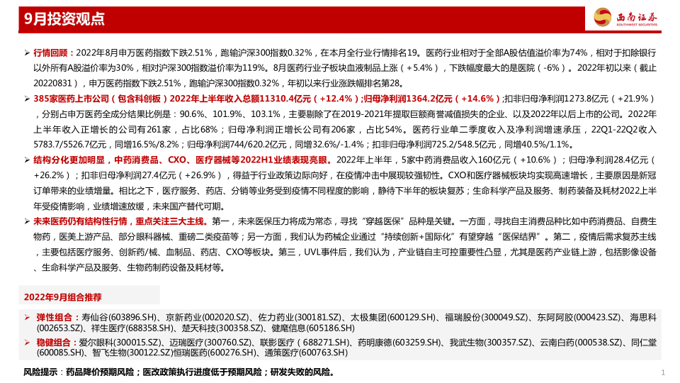 本报告的核心观点是:2022年9月,医药行业整体表现低迷,但结构性行情依然可期。报告建议关注三大投资主线:一是寻找“穿越医保”的品种,例如中药消费品、自费生物药等;二是关注疫情后需求复苏的主线,例如医疗服务、创新药械等;三是关注产业链自主可控,特别是医药产业链上游。报告还提供了弹性和稳健两类投资组合推荐,并提示了药品降价、医改政策执行进度低于预期以及研发失败等风险。