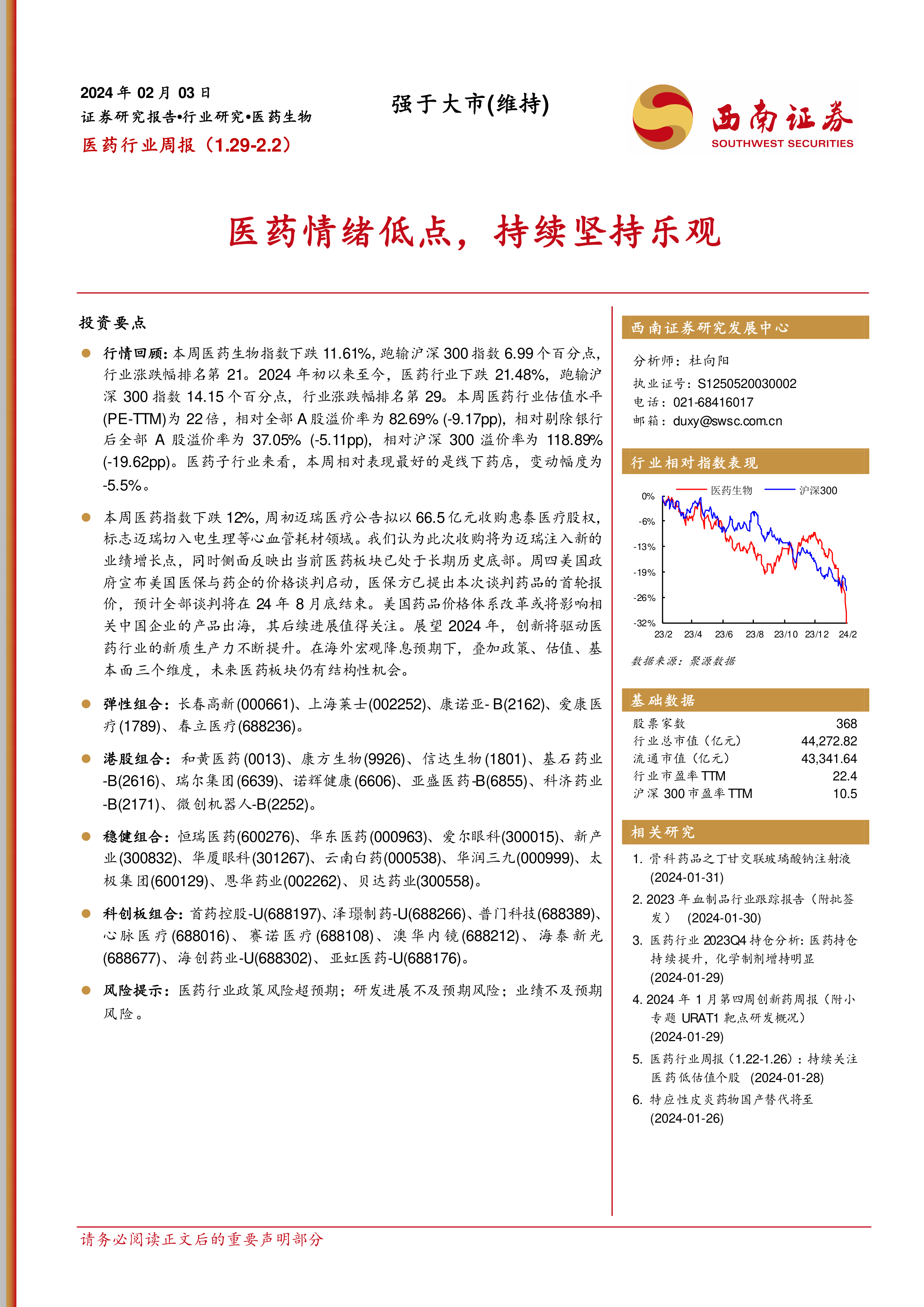 本报告对 2024 年 1 月 29 日至 2 月 2 日一周的医药行业进行了全面分析。报告指出,尽管本周医药行业整体表现低迷,但长期来看,创新驱动和政策支持将为医药行业带来结构性机会。报告提供了详细的市场数据、投资组合建议以及最新的行业新闻和政策解读,为投资者提供了全面的参考信息。 需要注意的是,报告中提到的投资组合和个股仅供参考,投资者应根据自身情况进行独立判断,并承担相应的投资风险。 报告也明确指出了医药行业面临的政策风险、研发风险和业绩风险等潜在风险因素。