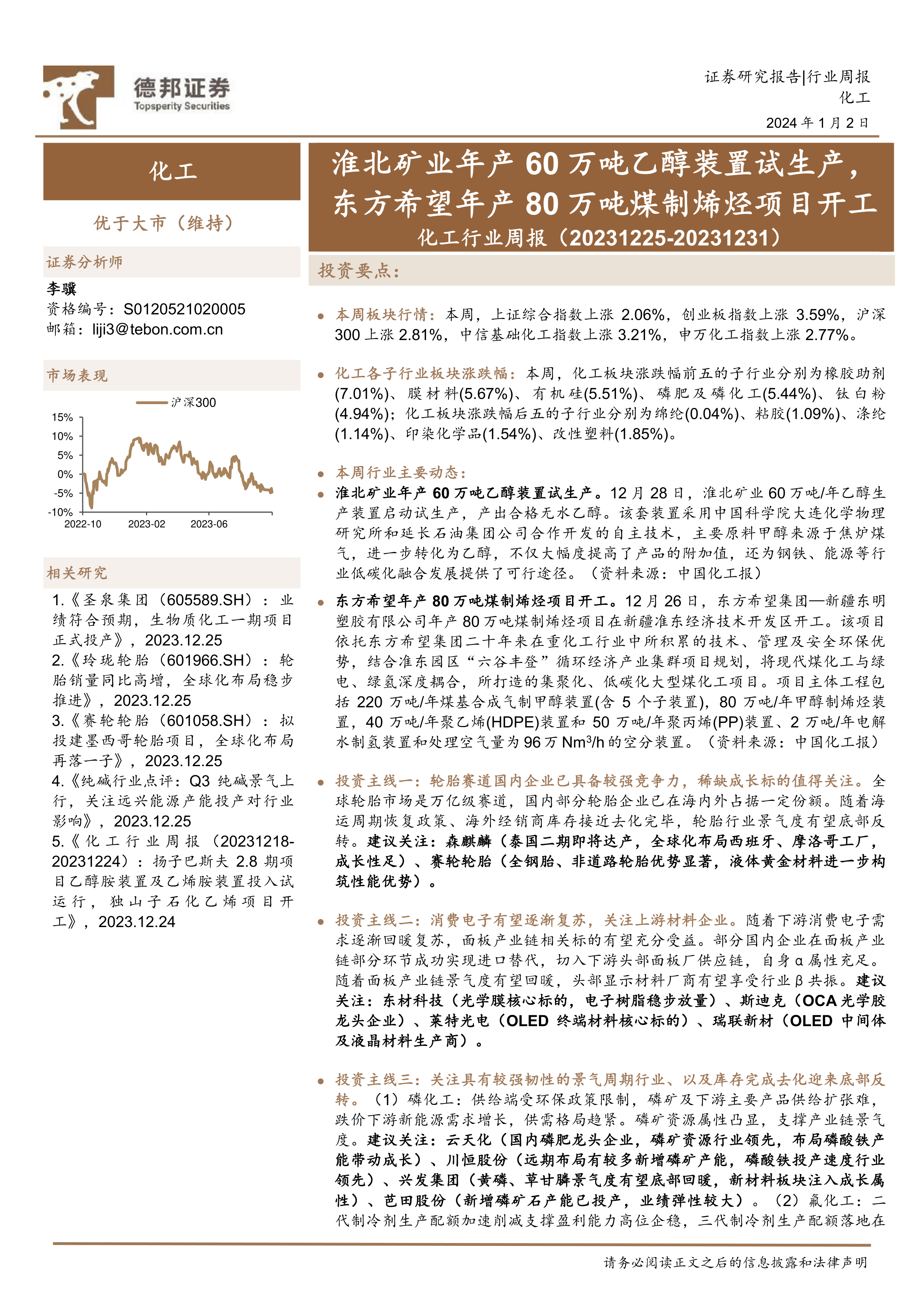 本报告的核心观点是:化工行业本周整体表现优于大市,部分子行业涨幅显著,主要受淮北矿业乙醇装置试生产和东方希望煤制烯烃项目开工等利好消息驱动。报告建议关注以下几条投资主线:具备全球竞争力的轮胎赛道、有望复苏的消费电子上游材料、具有韧性的景气周期行业(磷化工、氟化工、涤纶长丝)以及受益于经济向好和需求复苏的化工龙头白马股。同时,报告也指出了宏观经济下行、油价大幅波动以及下游需求不及预期等潜在风险。