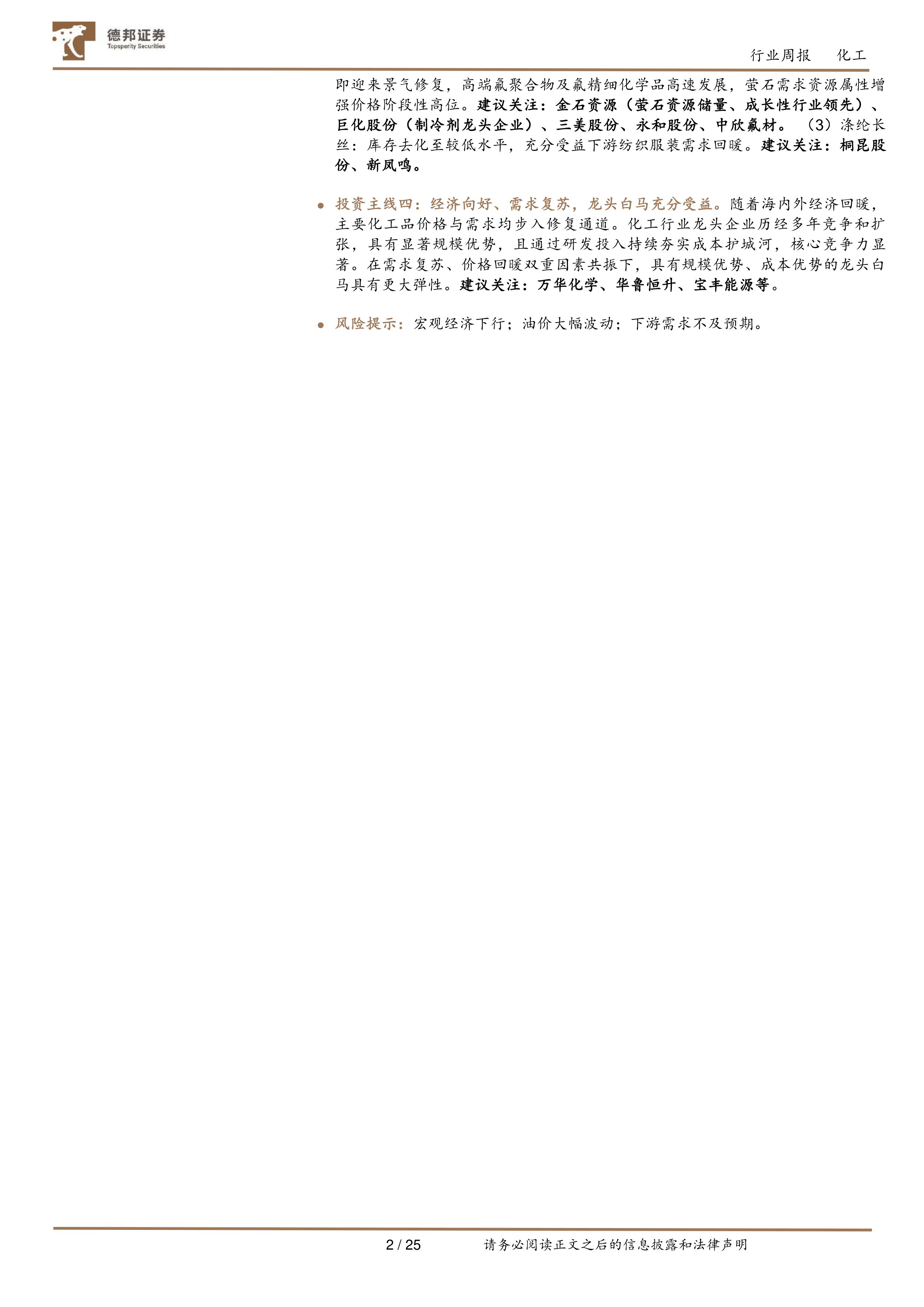 投资主线三:关注具有较强韧性的景气周期行业、以及库存完成去化迎来底部反转。(1)磷化工:供给端受环保政策限制,磷矿及下游主要产品供给扩张难,跌价下游新能源需求增长,供需格局趋紧。磷矿资源属性凸显,支撑产业链景气度。建议关注:云天化(国内磷肥龙头企业,磷矿资源行业领先,布局磷酸铁产能带动成长)、川恒股份(远期布局有较多新增磷矿产能,磷酸铁投产速度行业领先)、兴发集团(黄磷、草甘膦景气度有望底部回暖,新材料板块注入成长属性)、芭田股份(新增磷矿石产能已投产,业绩弹性较大)。(2)氟化工:二代制冷剂生产配额加速削减支撑盈利能力高位企稳,三代制冷剂生产配额落地在即迎来景气修复,高端氟聚合物及氟精细化学品高速发展,萤石需求资源属性增强价格阶段性高位。建议关注:金石资源(萤石资源储量、成长性行业领先)、巨化股份(制冷剂龙头企业)、三美股份、永和股份、中欣氟材。(3)涤纶长丝:库存去化至较低水平,充分受益下游纺织服装需求回暖。建议关注:桐昆股份、新凤鸣。