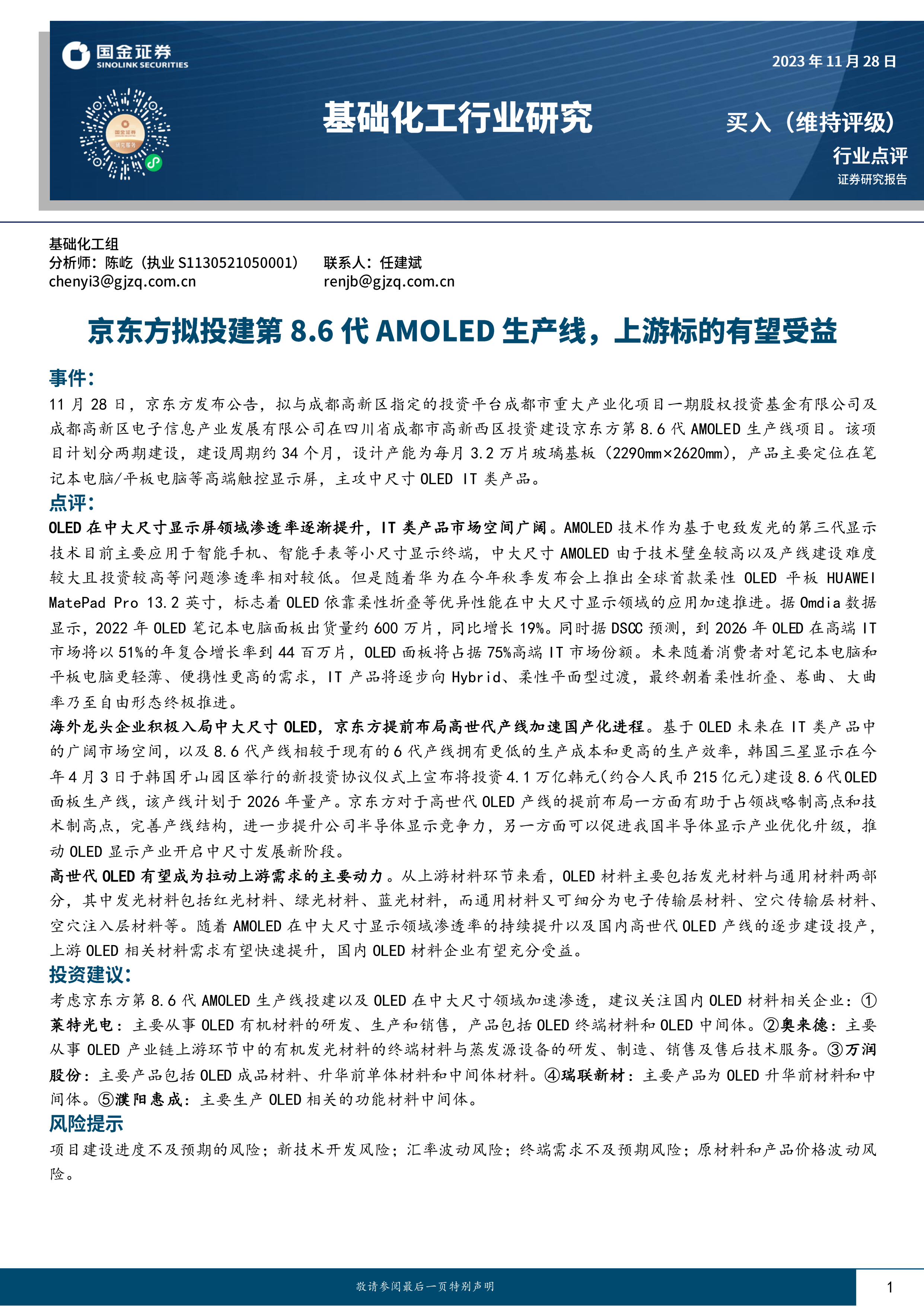 基础化工行业研究:京东方拟投建第8.6代AMOLED生产线,上游标的有望受益