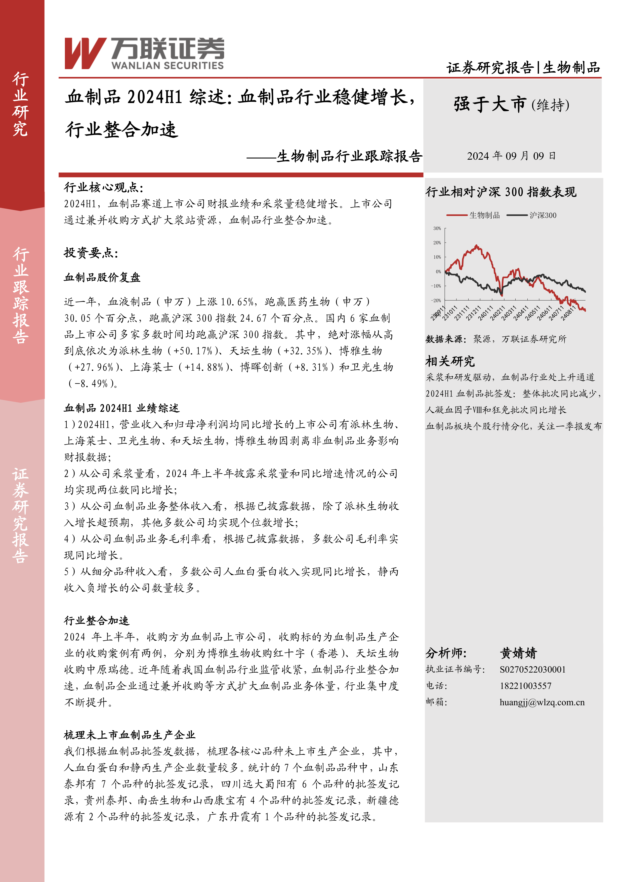 生物制品行业跟踪报告:血制品2024H1综述:血制品行业稳健增长,行业整合加速