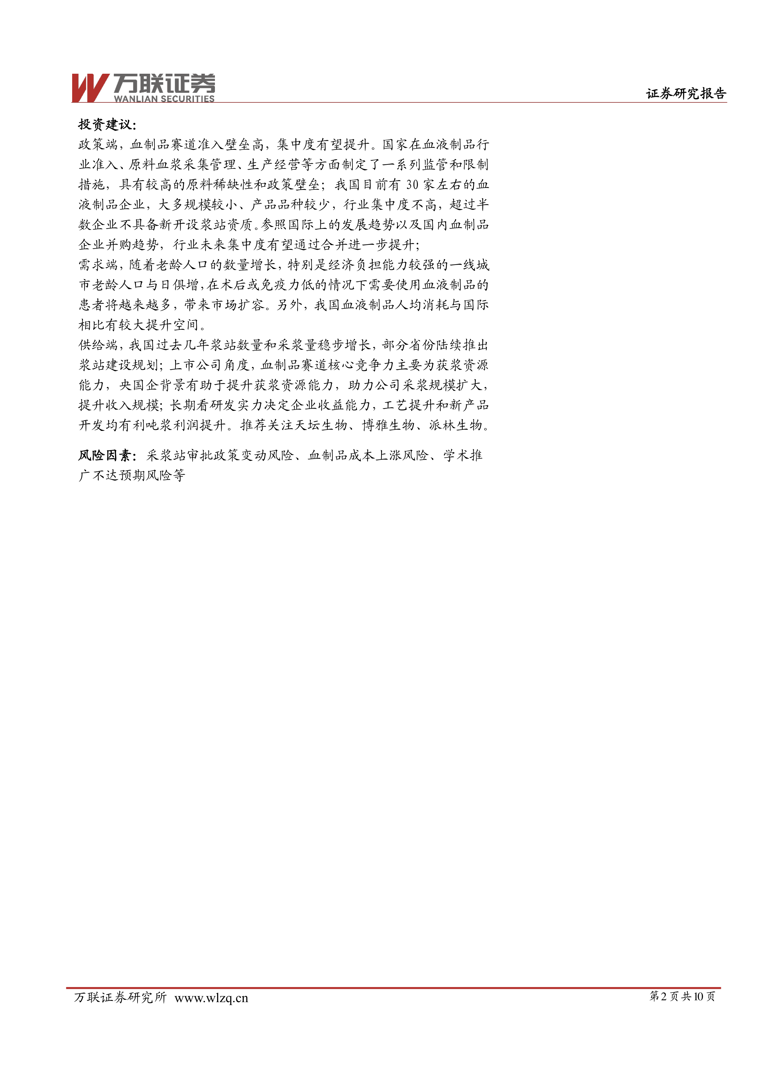 报告最后给出了投资建议,认为血制品行业具有高准入门槛和持续增长潜力,并推荐关注天坛生物、博雅生物、派林生物等公司。 同时,报告也指出了采浆站审批政策变动、血制品成本上涨、学术推广不达预期等潜在风险因素。 报告还提供了相关上市公司的估值情况,方便投资者进行投资决策。