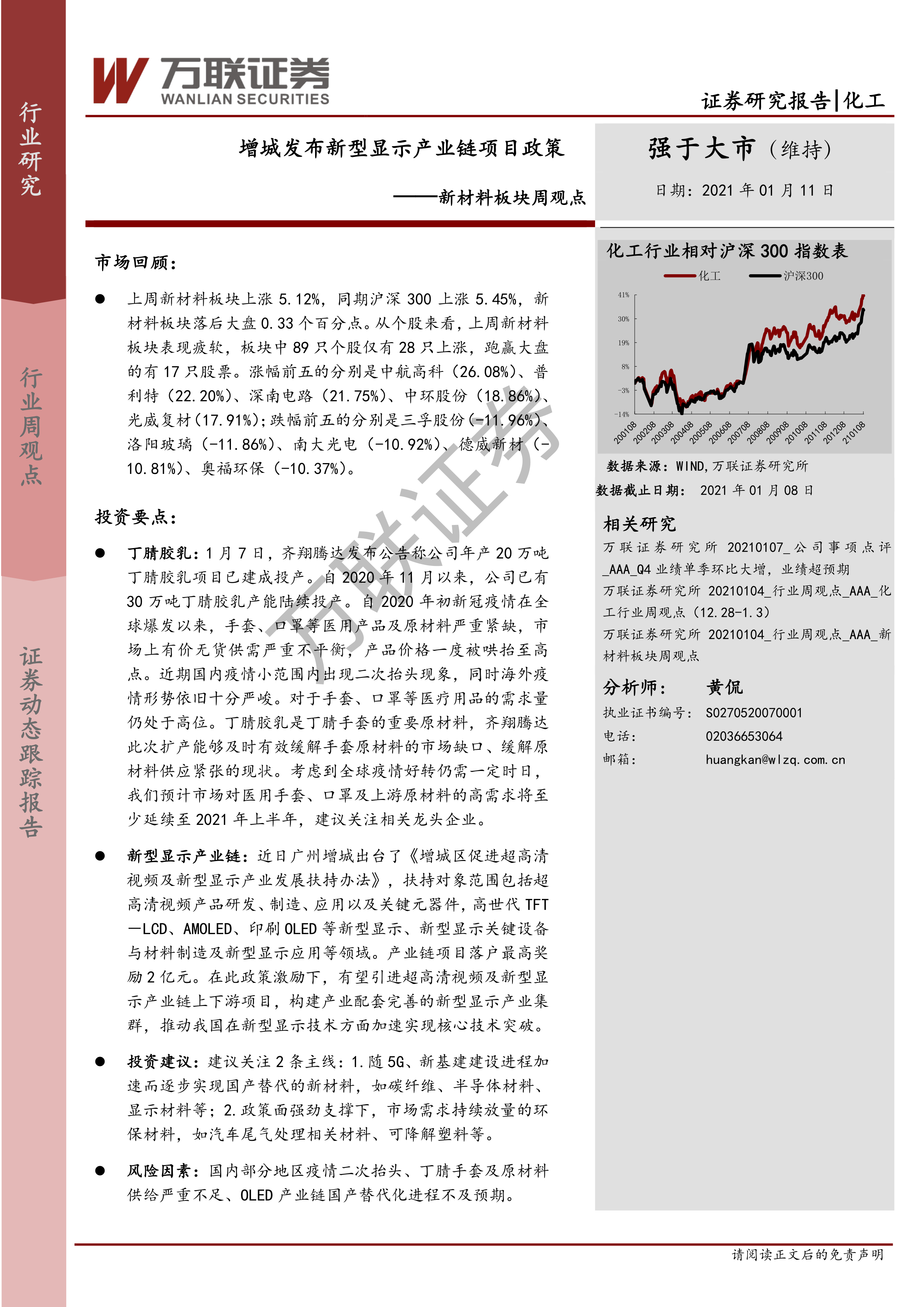 本报告的核心观点是:新材料行业上周表现略逊于大盘,但部分细分领域展现出强劲增长潜力。丁腈胶乳因全球疫情持续和医用手套需求旺盛而供不应求,价格高企,相关企业值得关注。新型显示产业链受益于广州增城出台的扶持政策,未来发展前景广阔。建议投资者关注两条主线:一是受益于5G、新基建建设进程加速的国产替代新材料;二是政策强力支撑下市场需求持续放量的环保材料。