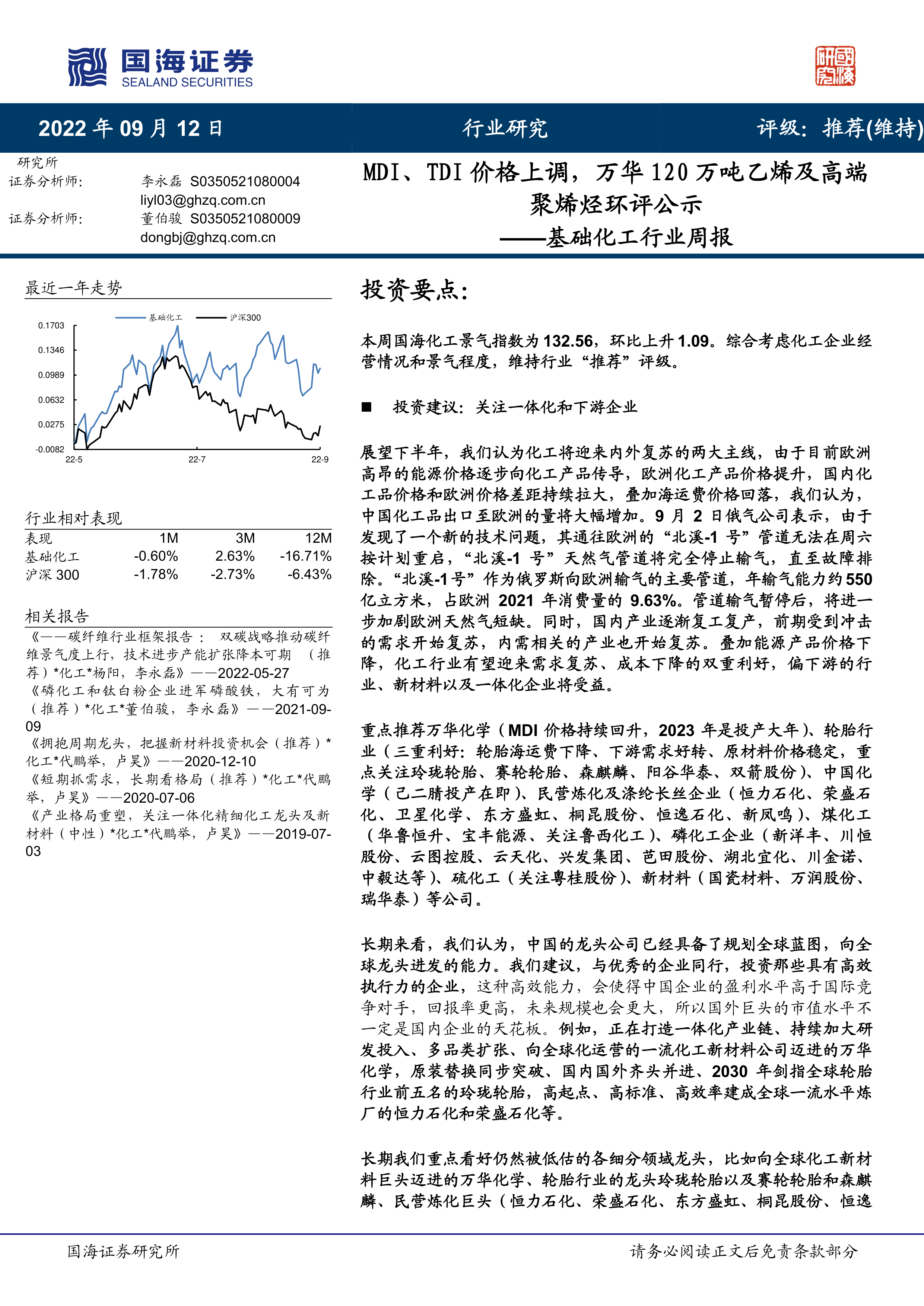 重点推荐万华化学(MDI价格持续回升,2023年是投产大年)、轮胎行业(三重利好:轮胎海运费下降、下游需求好转、原材料价格稳定,重点关注玲珑轮胎、赛轮轮胎、森麒麟、阳谷华泰、双箭股份)、中国化学(己二腈投产在即)、民营炼化及涤纶长丝企业(恒力石化、荣盛石化、卫星化学、东方盛虹、桐昆股份、恒逸石化、新凤鸣)、煤化工(华鲁恒升、宝丰能源、关注鲁西化工)、磷化工企业(新洋丰、川恒股份、云图控股、云天化、兴发集团、芭田股份、湖北宜化、川金诺、中毅达等)、硫化工(关注粤桂股份)、新材料(国瓷材料、万润股份、瑞华泰)等公司。