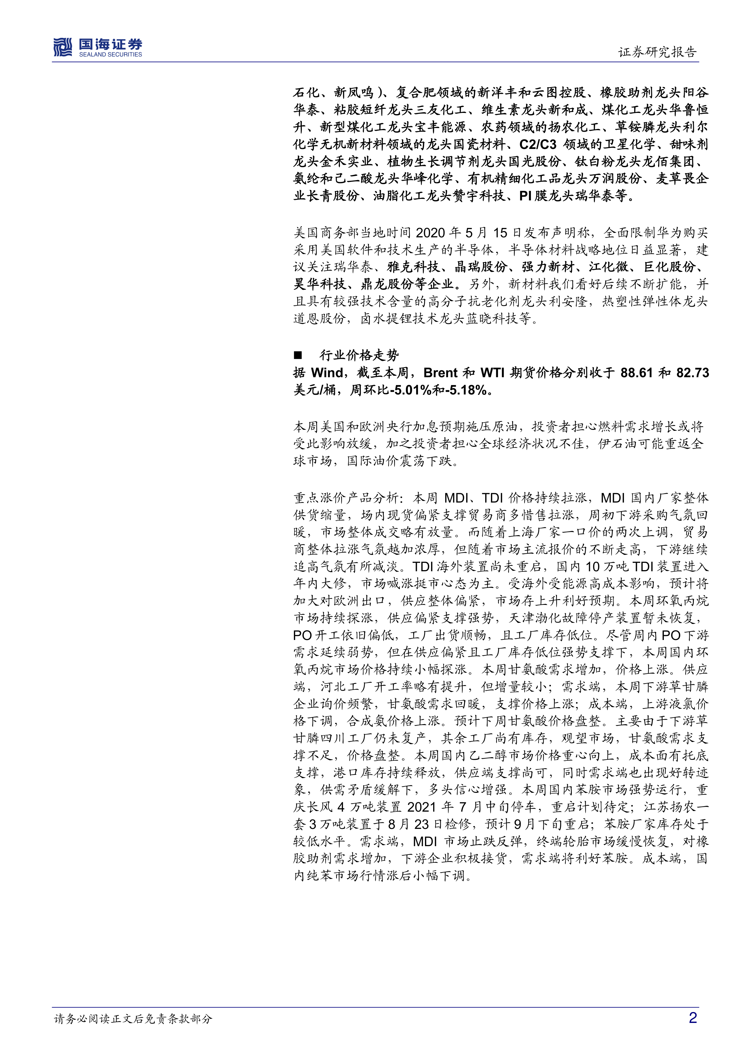 本报告详细跟踪了多个重点化工公司的动态,并对行业价格走势进行了分析,内容涵盖以下几个方面:
