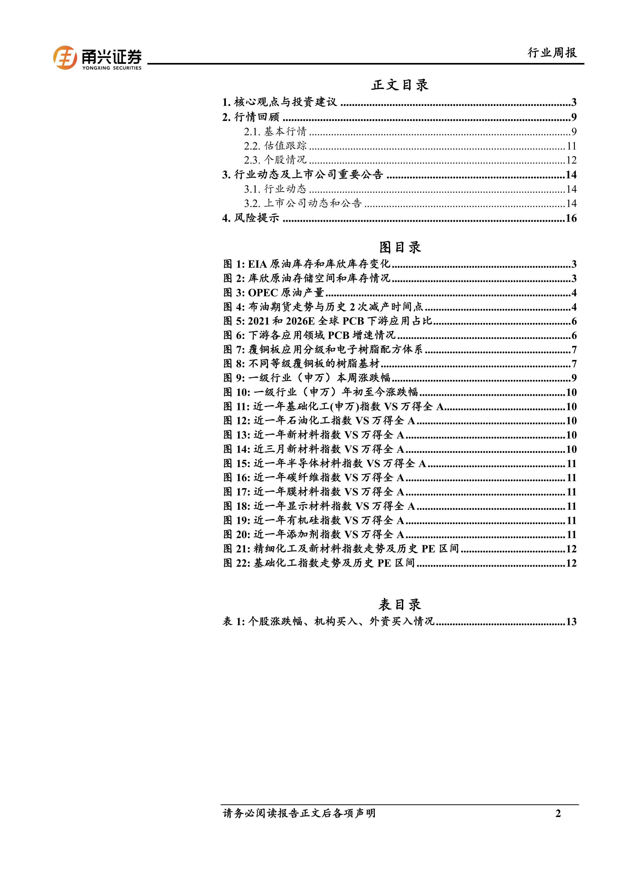 报告最后给出了投资建议和风险提示。报告建议继续关注基础化工行业顺周期头部企业以及新材料行业中受益于国产替代和新兴科技驱动的企业。报告也提示了宏观经济增速低于预期、国际油价大跌以及竞争加剧等风险因素。