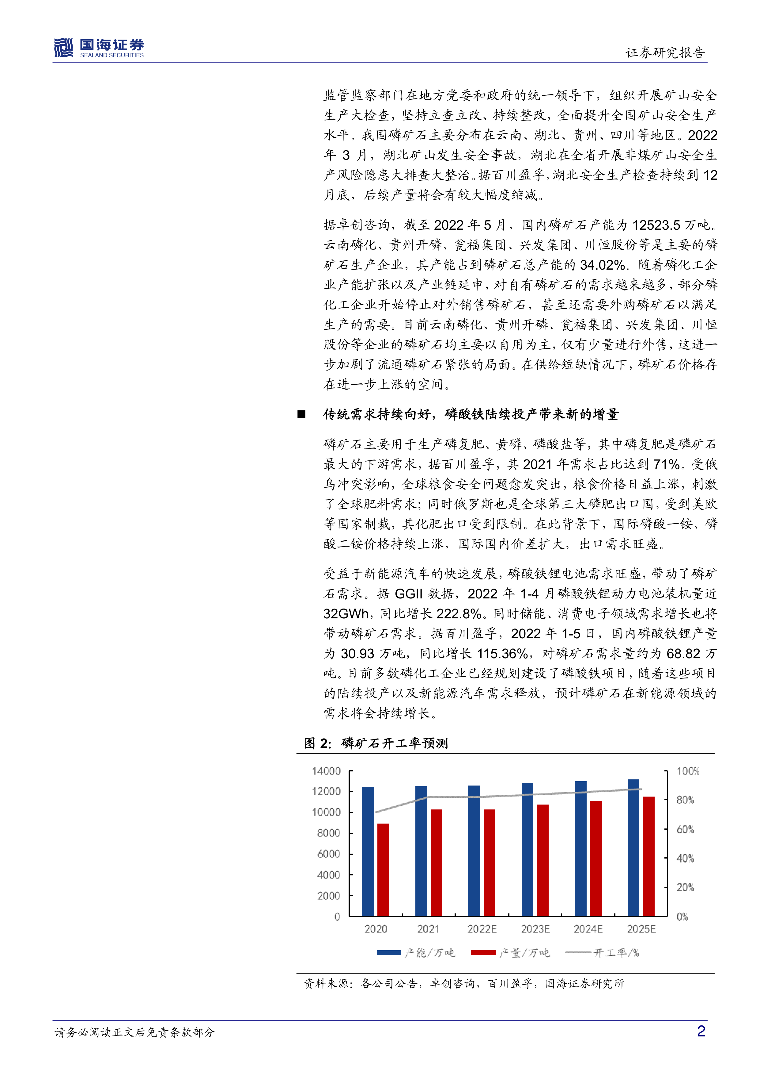 报告指出,2022年4月开始的全国矿山安全生产大检查,以及湖北地区因安全事故导致的生产限制,都导致磷矿石产量减少。此外,主要磷矿石生产企业为了满足自身磷化工产品的生产需求,减少了对外销售,进一步加剧了供给短缺。 需求方面,全球粮食安全问题和新能源汽车产业的快速发展,分别带动了磷复肥和磷酸铁锂电池对磷矿石的需求增长。