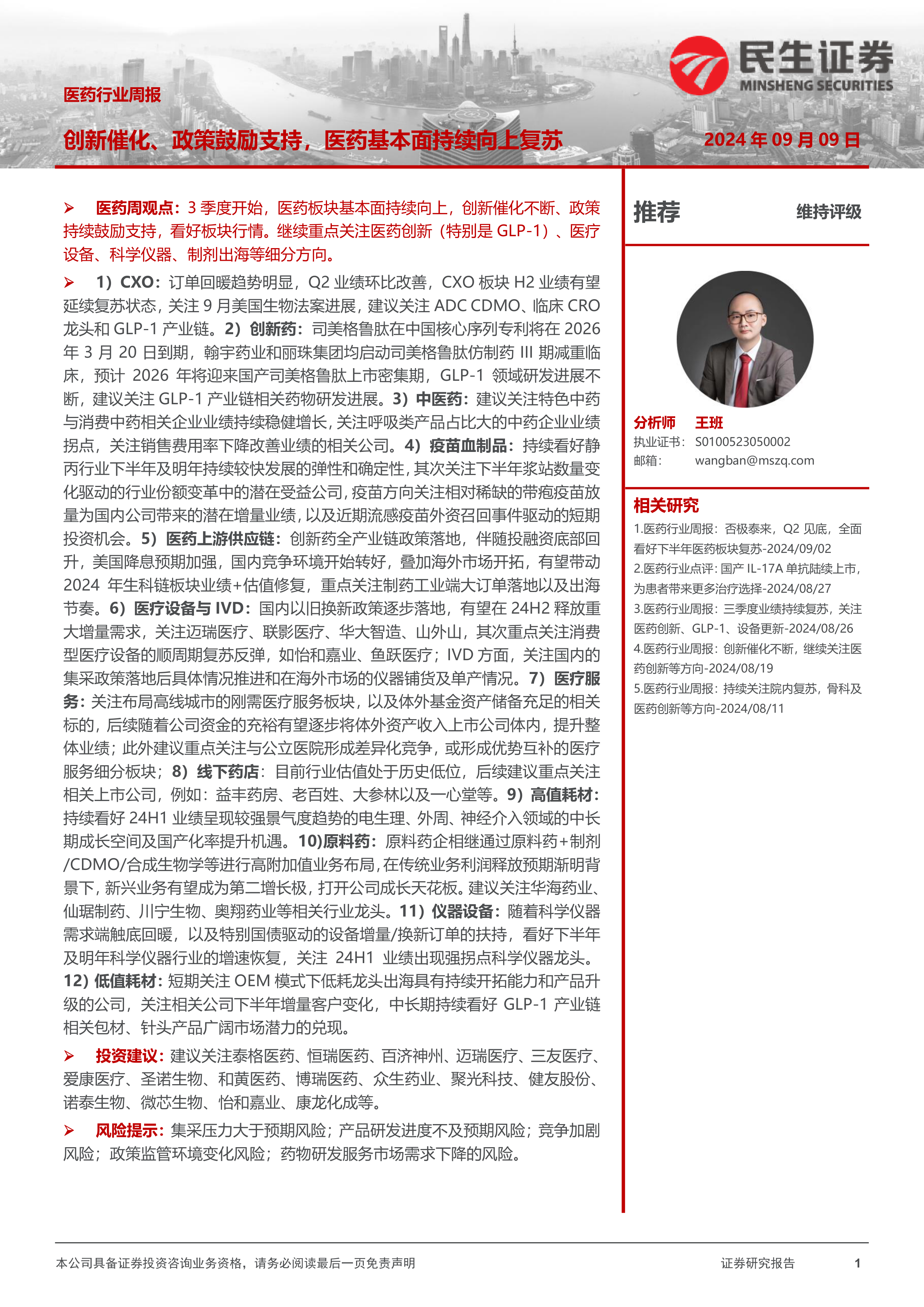 1)CXO:订单回暖趋势明显,Q2业绩环比改善,CXO板块H2业绩有望延续复苏状态,关注9月美国生物法案进展,建议关注ADC CDMO、临床CRO龙头和GLP-1产业链。2)创新药:司美格鲁肽在中国核心序列专利将在2026年3月20日到期,翰宇药业和丽珠集团均启动司美格鲁肽仿制药III期减重临床,预计2026年将迎来国产司美格鲁肽上市密集期,GLP-1领域研发进展不断,建议关注GLP-1产业链相关药物研发进展。3)中医药:建议关注特色中药与消费中药相关企业业绩持续稳健增长,关注呼吸类产品占比大的中药企业业绩拐点,关注销售费用率下降改善业绩的相关公司。4)疫苗血制品:持续看好静丙行业下半年及明年持续较快发展的弹性和确定性,其次关注下半年浆站数量变化驱动的行业份额变革中的潜在受益公司,疫苗方向关注相对稀缺的带疱疫苗放量为国内公司带来的潜在增量业绩,以及近期流感疫苗外资召回事件驱动的短期投资机会。5)医药上游供应链:创新药全产业链政策落地,伴随投融资底部回升,美国降息预期加强,国内竞争环境开始转好,叠加海外市场开拓,有望带动2024年生科链板块业绩+估值修复,重点关注制药工业端大订单落地以及出海节奏。6)医疗设备与IVD:国内以旧换新政策逐步落地,有望在24H2释放重大增量需求,关注迈瑞医疗、联影医疗、华大智造、山外山,其次重点关注消费型医疗设备的顺周期复苏反弹,如怡和嘉业、鱼跃医疗;IVD方面,关注国内的集采政策落地后具体情况推进和在海外市场的仪器铺货及单产情况。7)医疗服务:关注布局高线城市的刚需医疗服务板块,以及体外基金资产储备充足的相关标的,后续随着公司资金的充裕有望逐步将体外资产收入上市公司体内,提升整体业绩;此外建议重点关注与公立医院形成差异化竞争,或形成优势互补的医疗服务细分板块;8)线下药店:目前行业估值处于历史低位,后续建议重点关注相关上市公司,例如:益丰药房、老百姓、大参林以及一心堂等。9)高值耗材:
