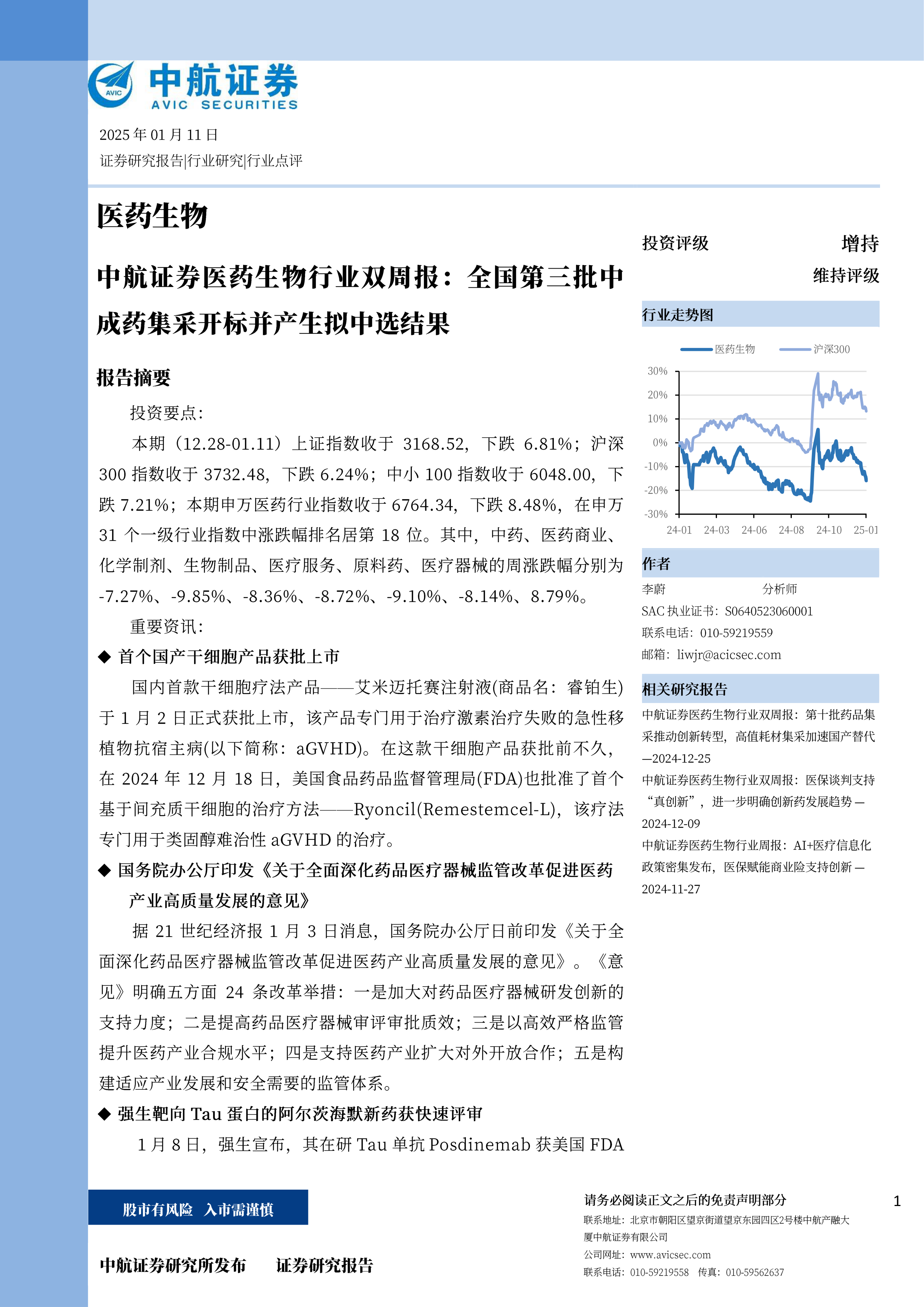 本期(12.28-01.11)上证指数收于3168.52,下跌6.81%;沪深300指数收于3732.48,下跌6.24%;中小100指数收于6048.00,下跌7.21%;本期申万医药行业指数收于6764.34,下跌8.48%,在申万31个一级行业指数中涨跌幅排名居第18位。其中,中药、医药商业、化学制剂、生物制品、医疗服务、原料药、医疗器械的周涨跌幅分别为-7.27%、-9.85%、-8.36%、-8.72%、-9.10%、-8.14%、8.79%。重要资讯: