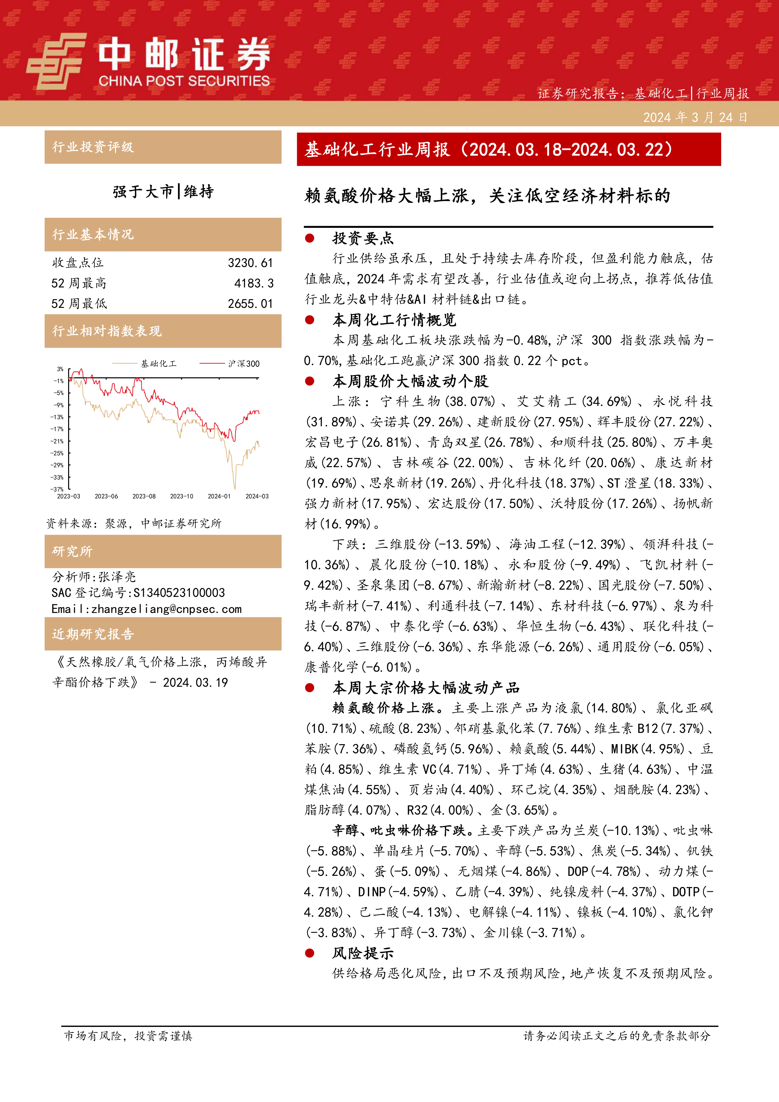基础化工行业周报:赖氨酸价格大幅上涨,关注低空经济材料标的
