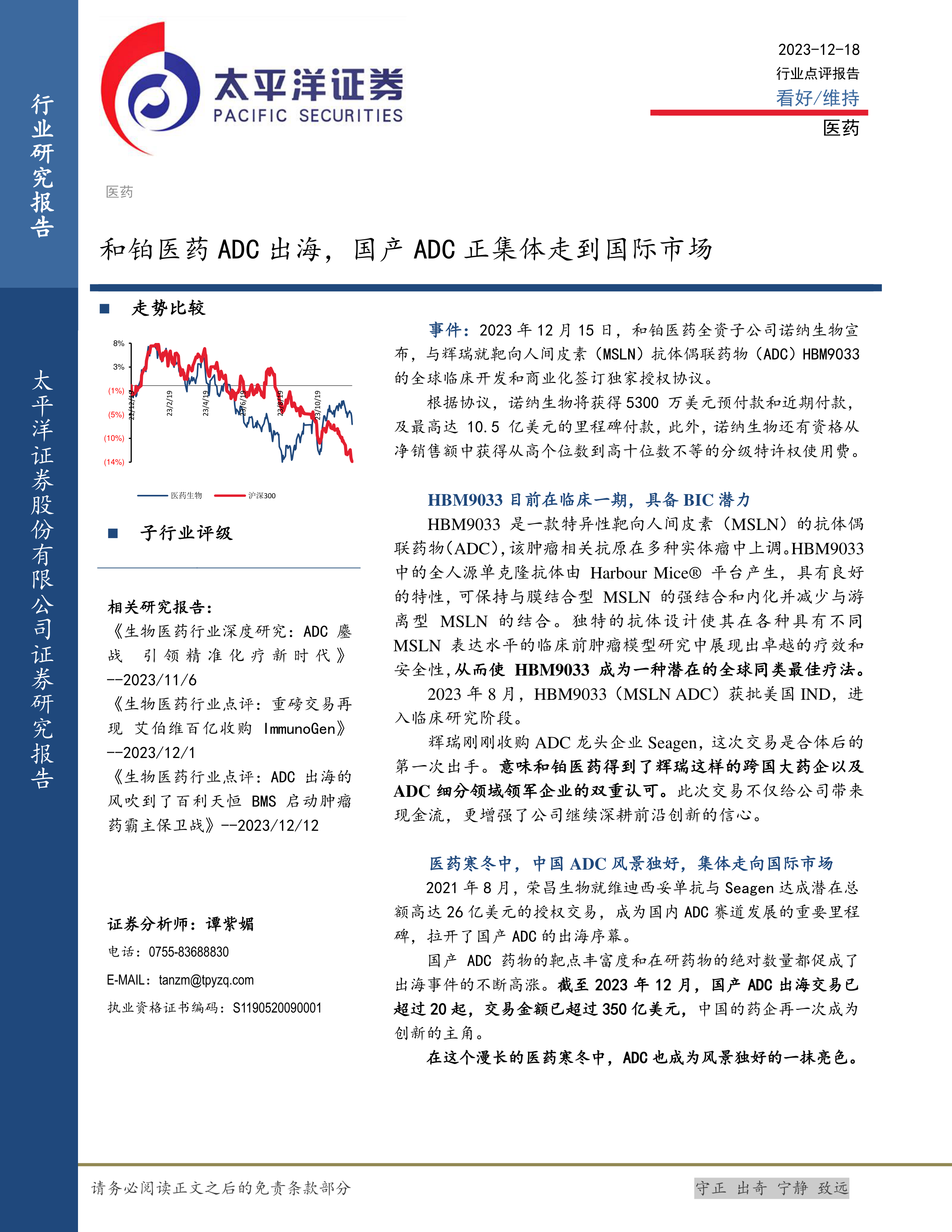 事件: 2023 年 12 月 15 日, 和铂医药全资子公司诺纳生物宣布,与辉瑞就靶向人间皮素(MSLN)抗体偶联药物(ADC) HBM9033的全球临床开发和商业化签订独家授权协议。