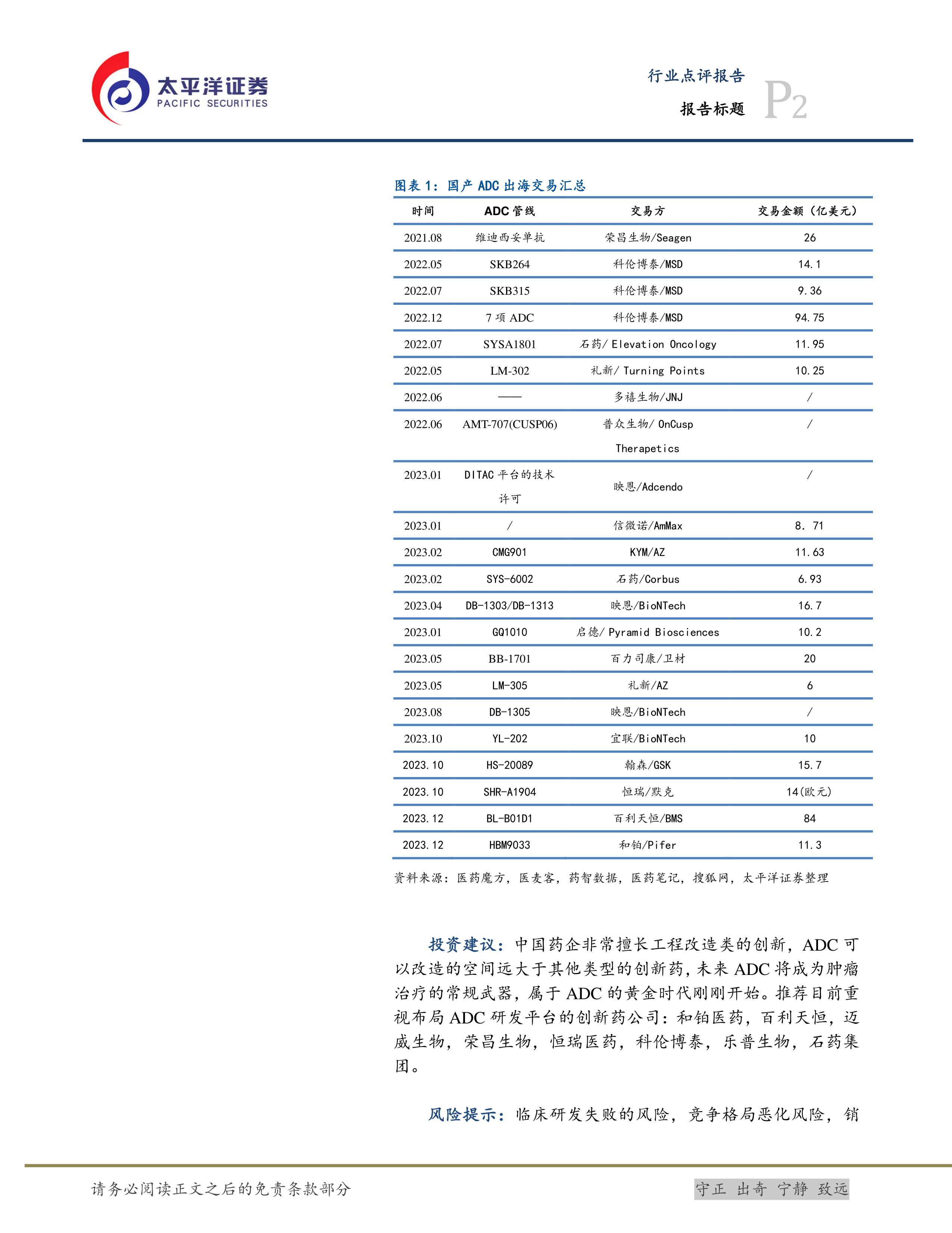 报告推荐了目前重视布局ADC研发平台的创新药公司,包括和铂医药、百利天恒、迈威生物、荣昌生物、恒瑞医药、科伦博泰、乐普生物、石药集团等。同时,报告也指出了临床研发失败的风险、竞争格局恶化风险、销售不及预期风险、行业政策风险、技术颠覆风险等潜在风险。