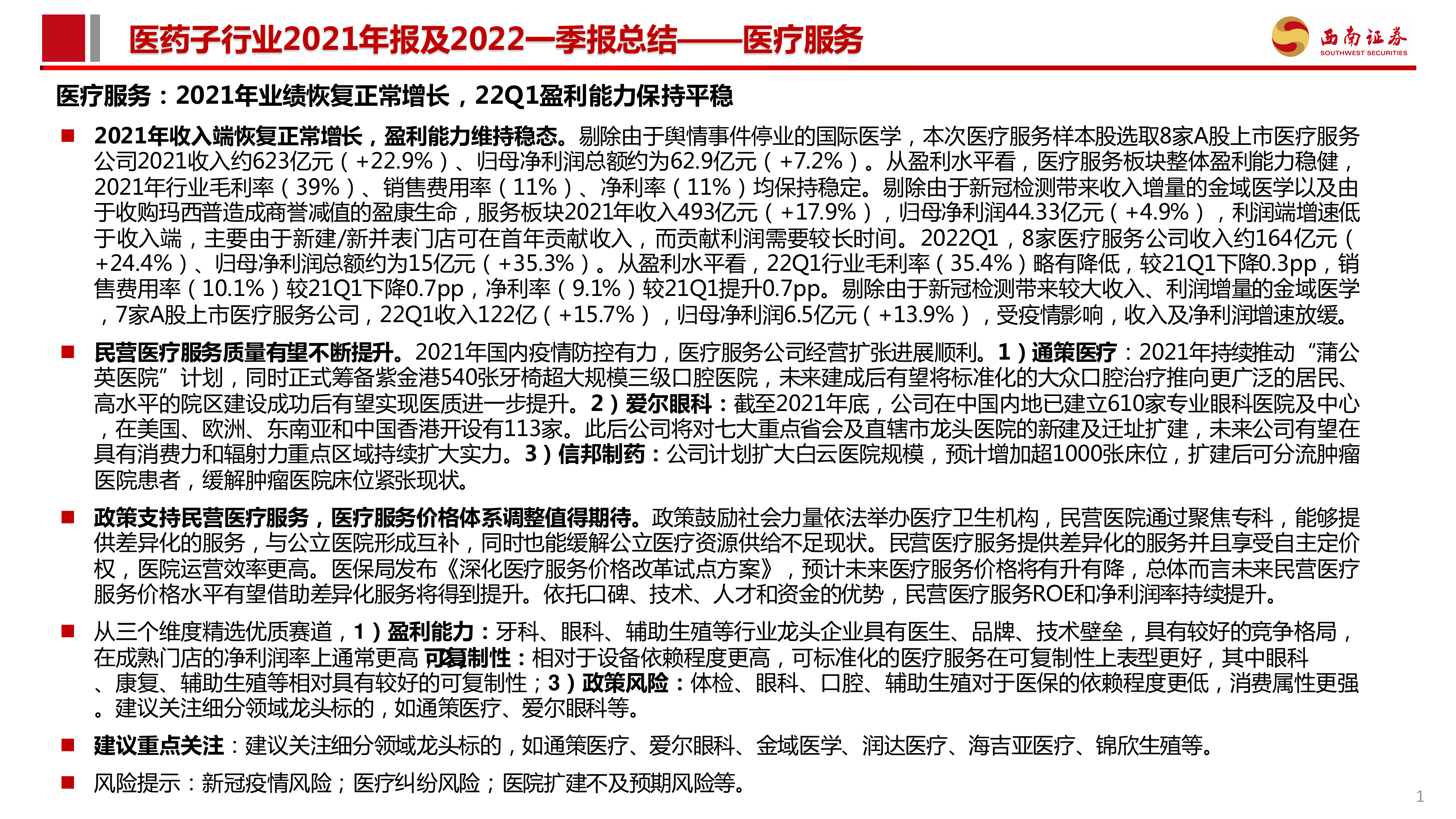 本报告基于西南证券研究发展中心对8家A股上市医疗服务公司2021年报及2022年第一季度报告的分析,核心观点如下: