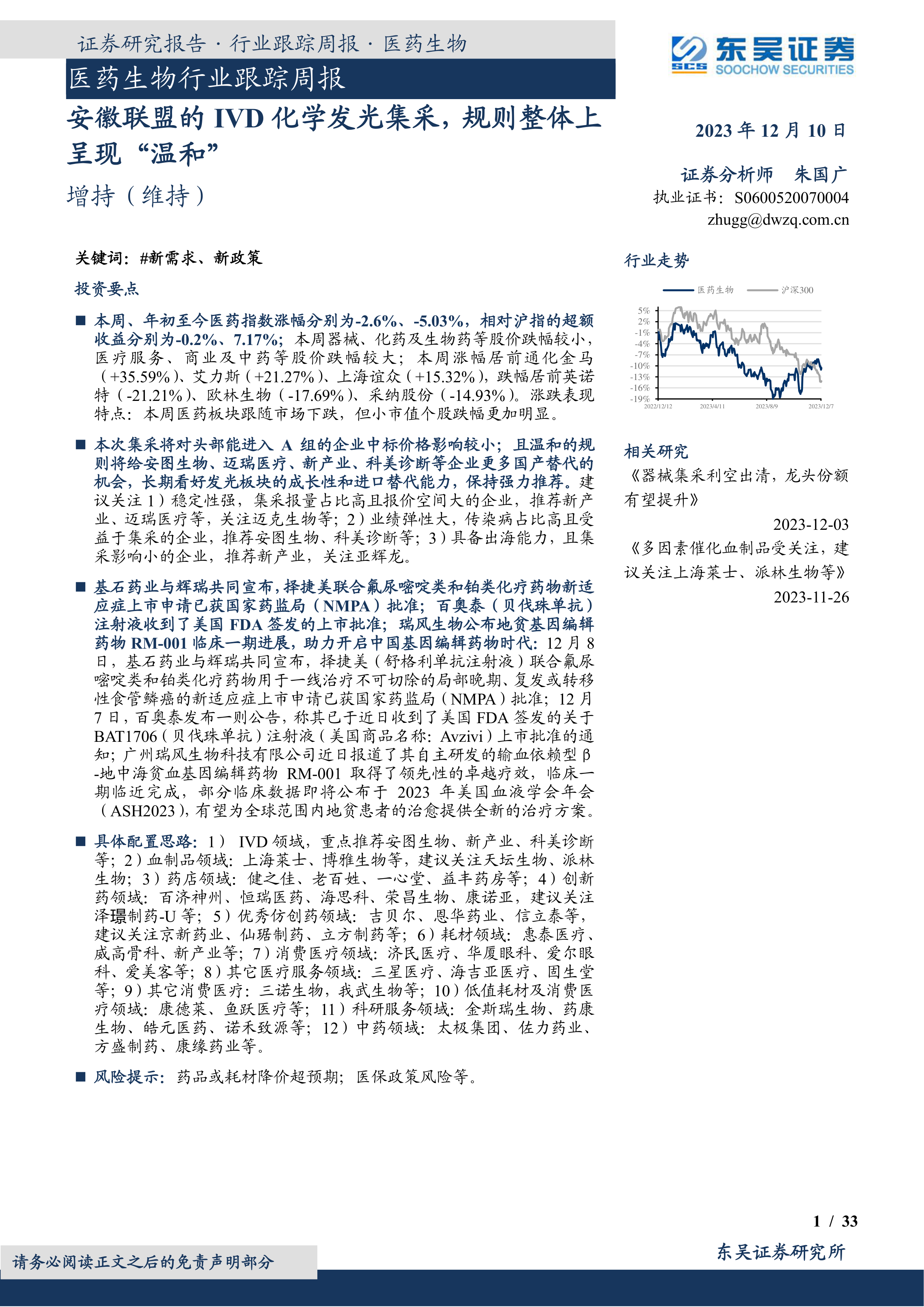 本报告的核心观点是:安徽联盟IVD化学发光集采规则整体温和,利好国产龙头企业。集采降价幅度好于预期,国产企业在传染病等项目报量领先,头部企业中标价格影响较小。长期看好发光板块的成长性和进口替代能力,建议关注具备稳定性、业绩弹性及出海能力的企业。医药板块整体跟随市场下跌,但小市值个股跌幅更明显,部分细分领域如创新药、医疗器械等仍有投资机会。