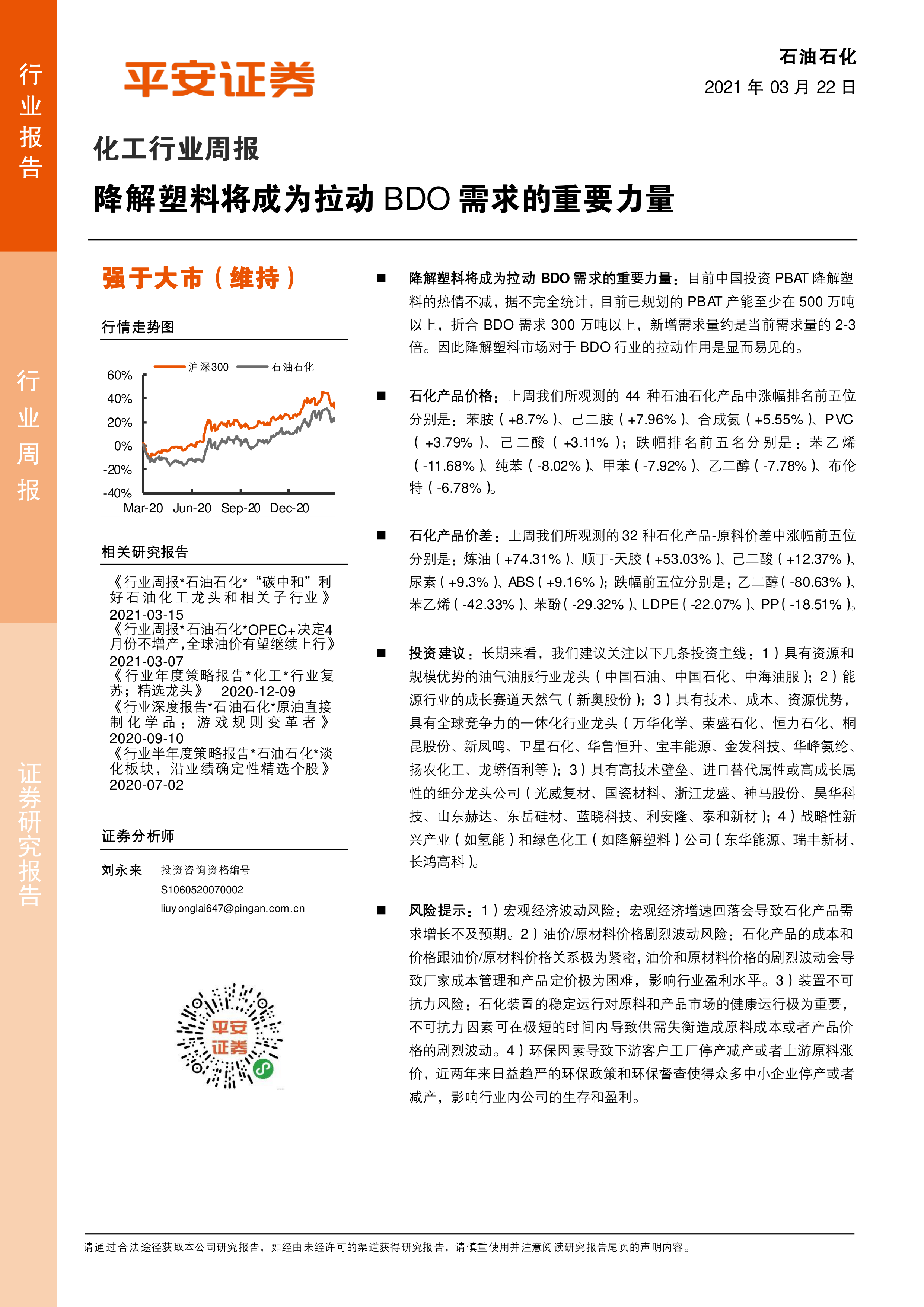 本报告深入分析了降解塑料对BDO需求的拉动作用,并对BDO价格上涨的原因进行了详细阐述。同时,报告对石油石化行业整体市场行情、估值以及投资建议进行了全面分析,并对行业内重点公司和政策动态进行了跟踪,为投资者提供了有价值的参考信息。报告也指出了行业面临的风险,提醒投资者谨慎投资。 报告认为,降解塑料行业的高速发展将持续推动BDO需求增长,而化工行业整体也具备较大的投资价值,但投资者需关注宏观经济、油价波动以及环保政策等风险因素。