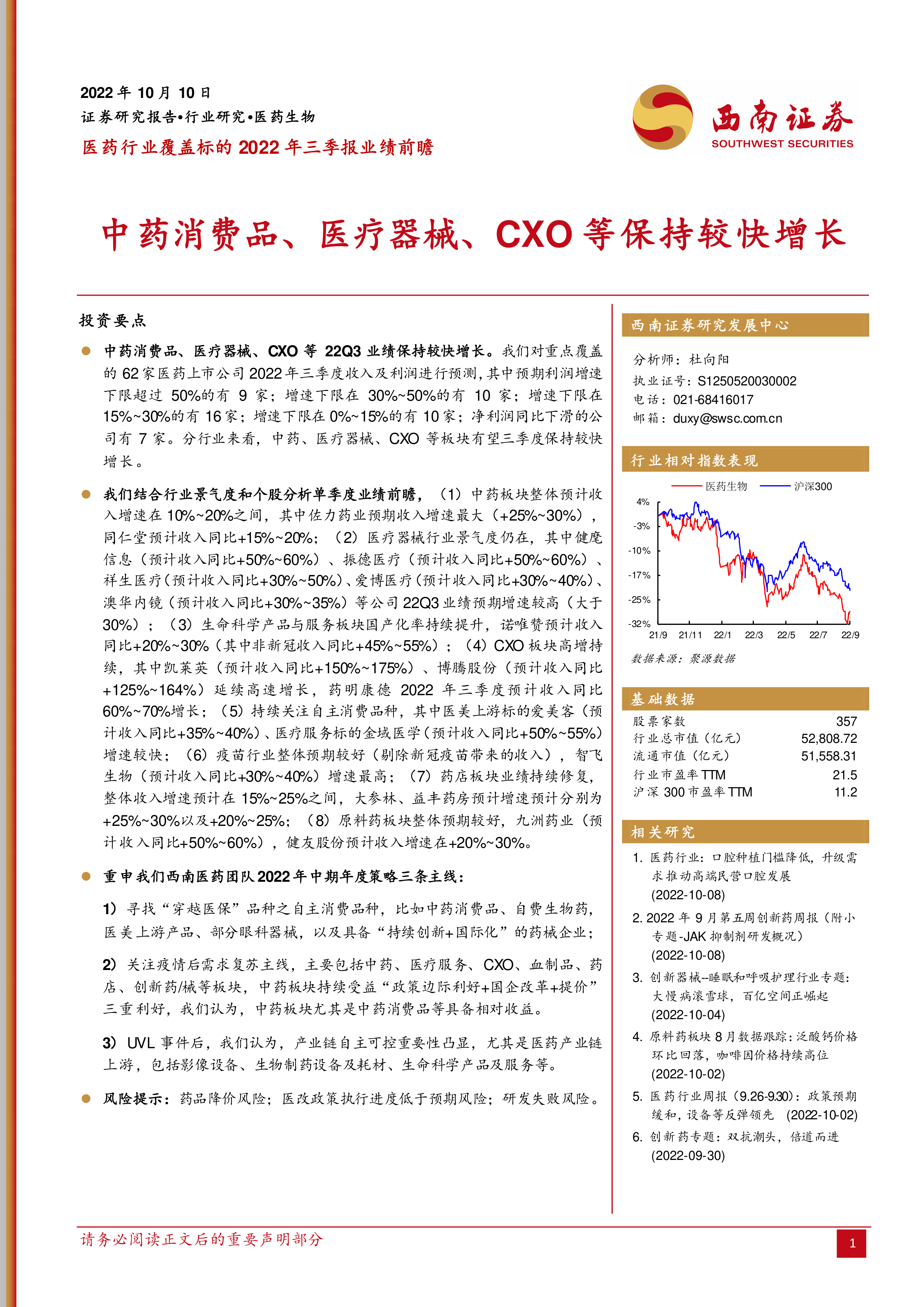 医药行业覆盖标的2022年三季报业绩前瞻:中药消费品、医疗器械、CXO等保持较快增长