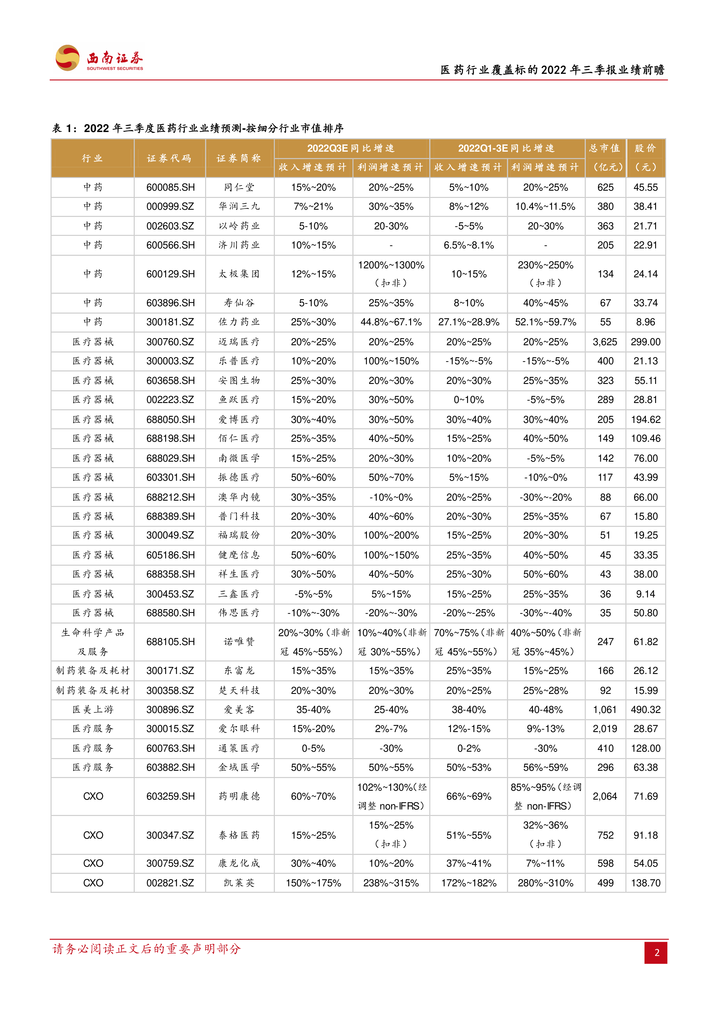 2022年三季度,医药行业整体表现稳健,部分细分板块保持较快增长。预测数据显示,预期利润增速下限超过50%的公司有9家,增速下限在30%~50%的有10家,增速下限在15%~30%的有16家。 这表明行业内存在结构性增长机会。