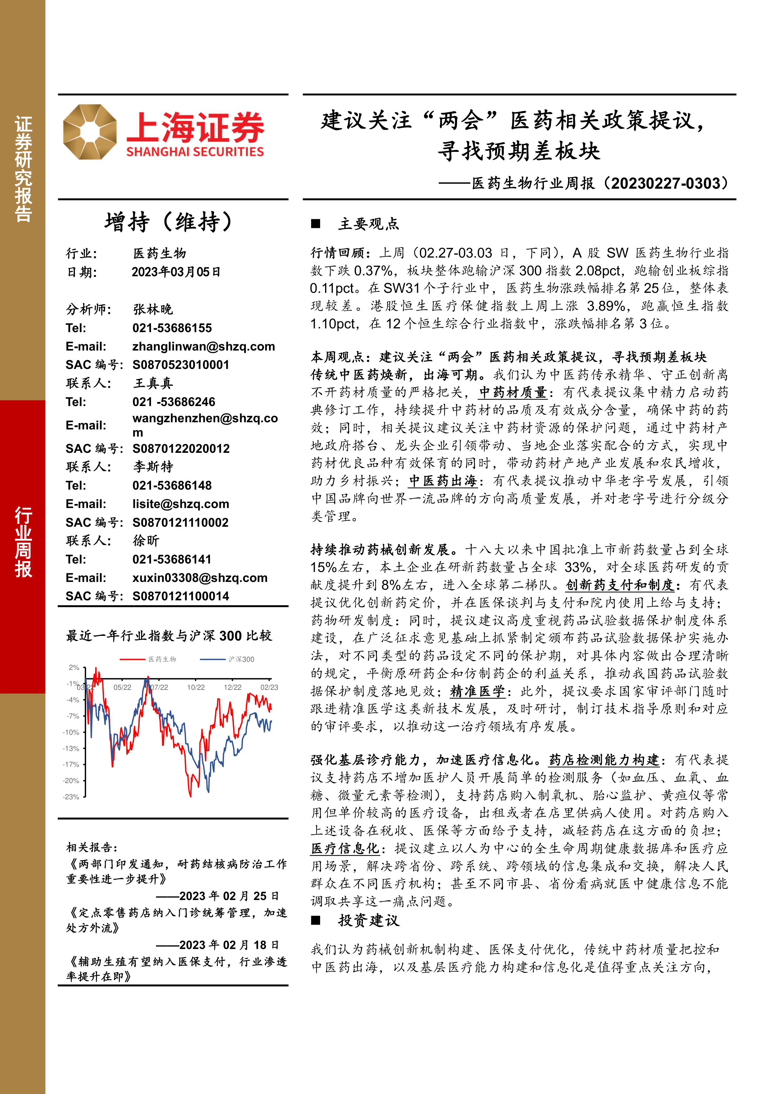 医药生物行业周报:建议关注“两会”医药相关政策提议,寻找预期差板块