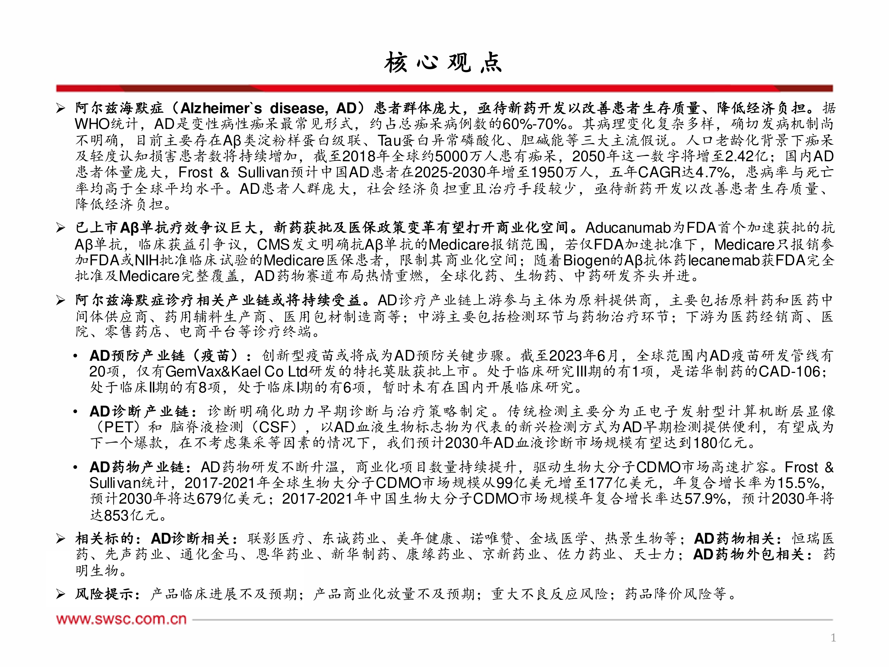 本报告的核心观点是:阿尔兹海默症(AD)患者群体庞大,社会经济负担沉重,迫切需要新药研发以改善患者生活质量并降低经济负担。虽然已上市的Aβ单抗疗效存在争议,但新药获批和医保政策变革有望打开商业化空间,从而推动AD诊疗相关产业链持续受益,特别是AD诊断和生物药CDMO市场。