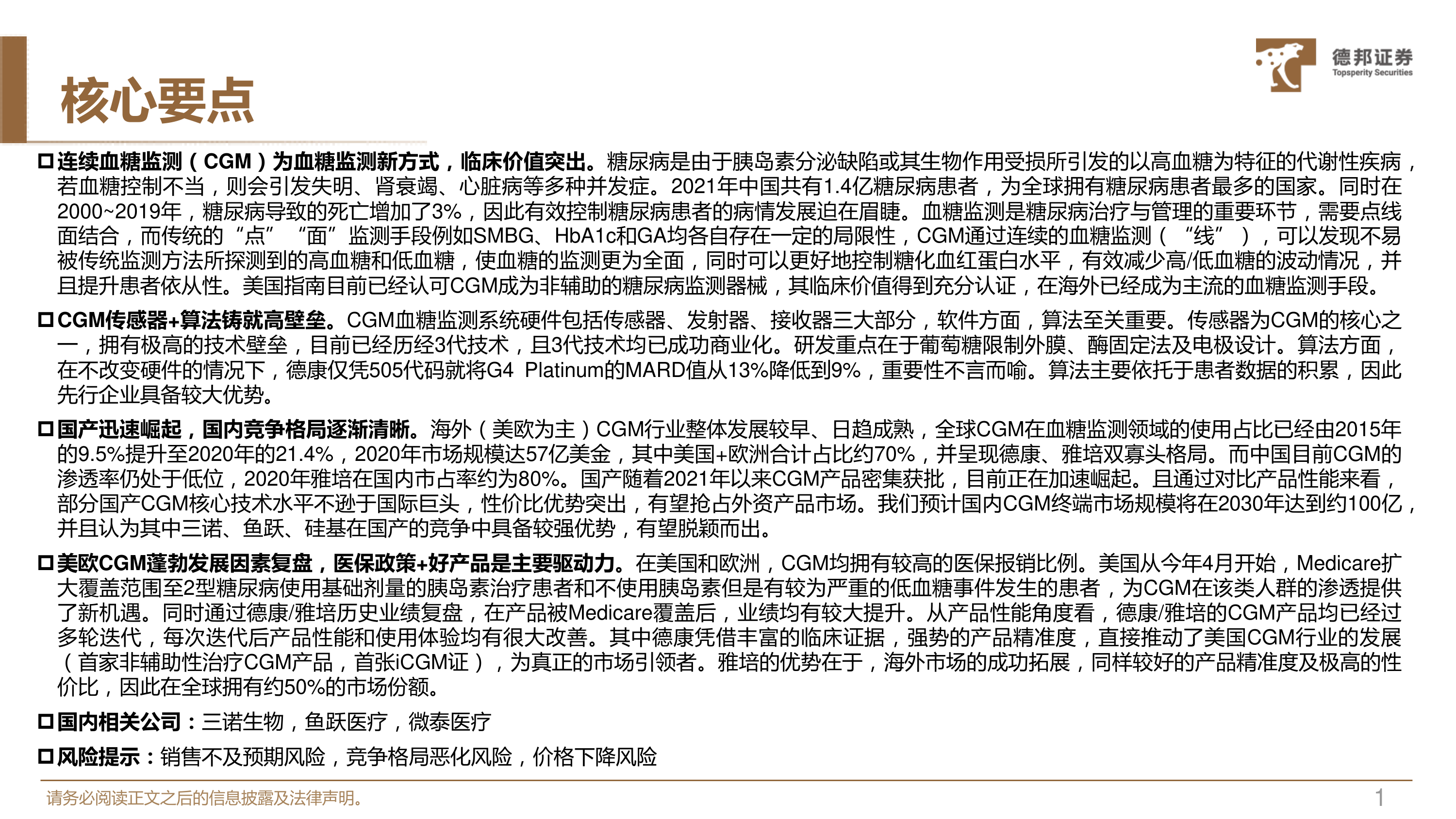本报告的核心观点是:连续血糖监测(CGM)技术作为血糖监测的新方式,具有显著的临床价值,其市场规模巨大,并呈现出国产加速崛起、全球竞争格局逐渐清晰的态势。 报告重点分析了CGM的技术壁垒、市场发展趋势、以及国内外主要企业的竞争格局,并对未来市场规模进行了预测。 具体而言,报告认为: