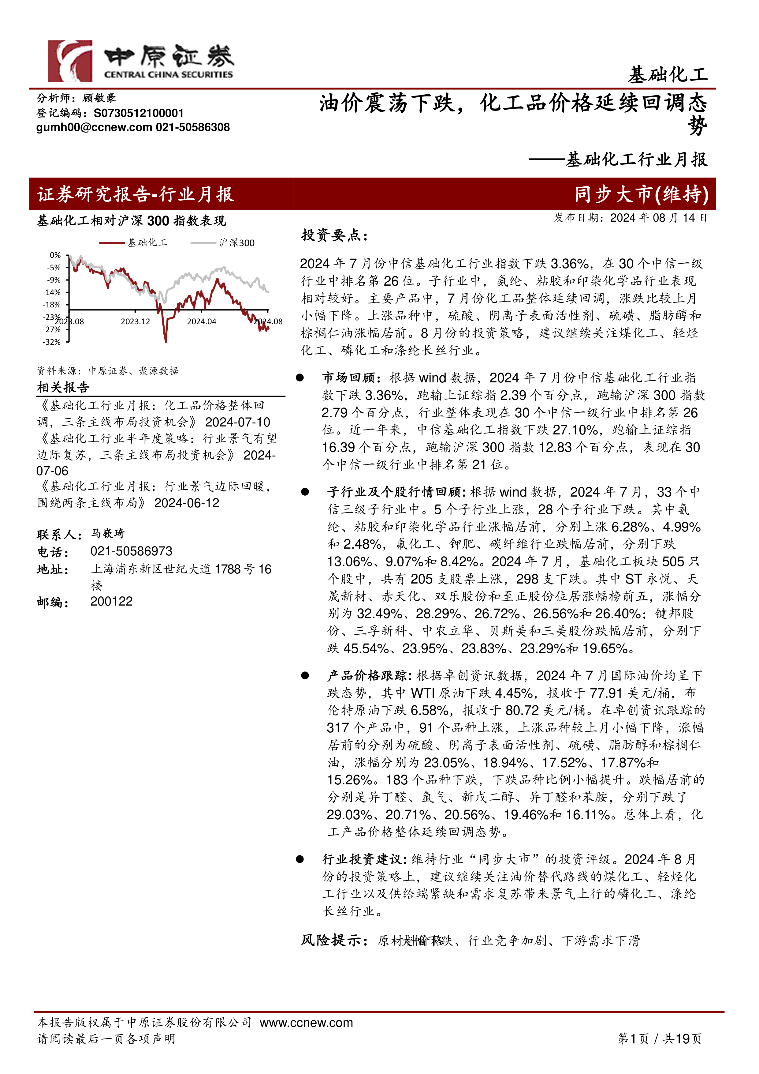 本报告对2024年7月份中国基础化工行业进行了全面的分析,涵盖了市场回顾、行业要闻、产品价格跟踪以及投资建议等方面。报告指出,7月份基础化工行业整体表现疲软,但部分子行业和个股表现相对较好。国际油价下跌导致化工品价格延续回调,但部分产品价格上涨。未来投资策略建议关注煤化工、轻烃化工、磷化工和涤纶长丝等行业,同时需关注原材料价格波动、行业竞争加剧和下游需求变化等风险。 报告数据主要来源于Wind数据和卓创资讯,为投资者提供了较为全面的行业分析和投资参考。