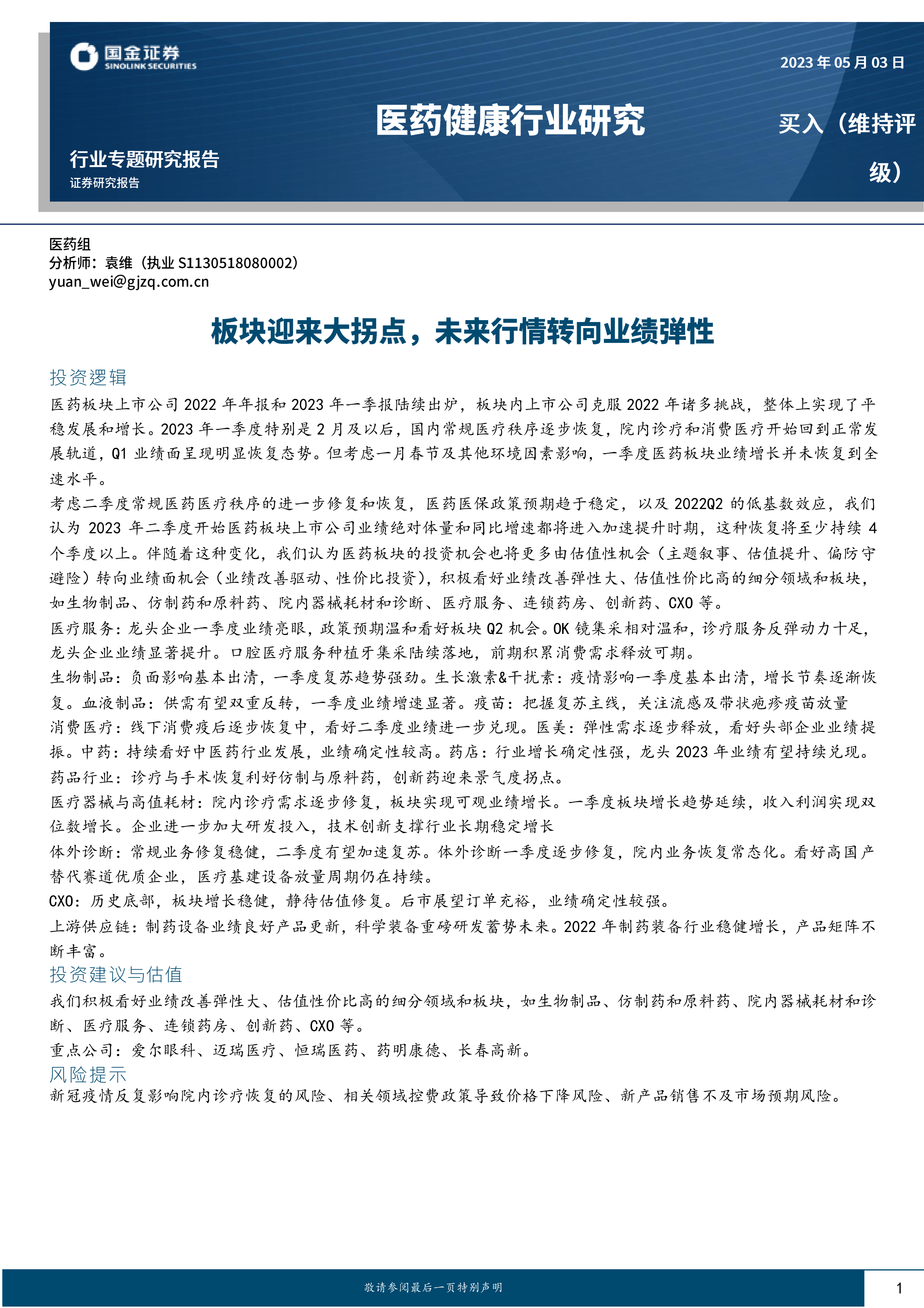 本报告对中国医药板块2022年年报和2023年一季报进行了深入分析,认为2023年二季度开始,医药板块业绩将加速提升,持续至少四个季度。投资机会将从估值驱动转向业绩驱动,建议关注生物制品、仿制药和原料药、院内器械耗材和诊断、医疗服务、连锁药房、创新药、CXO等业绩改善弹性大、估值性价比高的细分领域和板块。 报告还列出了重点关注的公司,并提示了新冠疫情反复、控费政策和新产品销售不及预期等风险。 需要注意的是,本报告仅供参考,不构成投资建议。