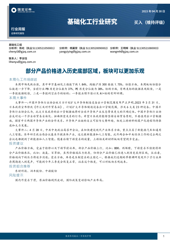 本周化工市场整体表现弱势,申万基础化工指数下跌,板块估值下降。虽然部分产品价格已触底,部分子行业库存周期接近尾声,未来有望复苏,但国内外需求下滑、原油价格波动和国际政策变动等风险依然存在。 投资建议关注一季报数据表现良好和利空出尽的标的,并密切关注市场变化和风险因素。 国金大化工团队对多个细分行业和上市公司进行了深入分析,为投资者提供了参考信息。 本报告中提供的图表数据清晰地展现了本周化工市场的主要变化,为投资者进行投资决策提供了数据支持。 此外,本报告还总结了本周化工行业的重要事件,为投资者了解行业动态提供了帮助。