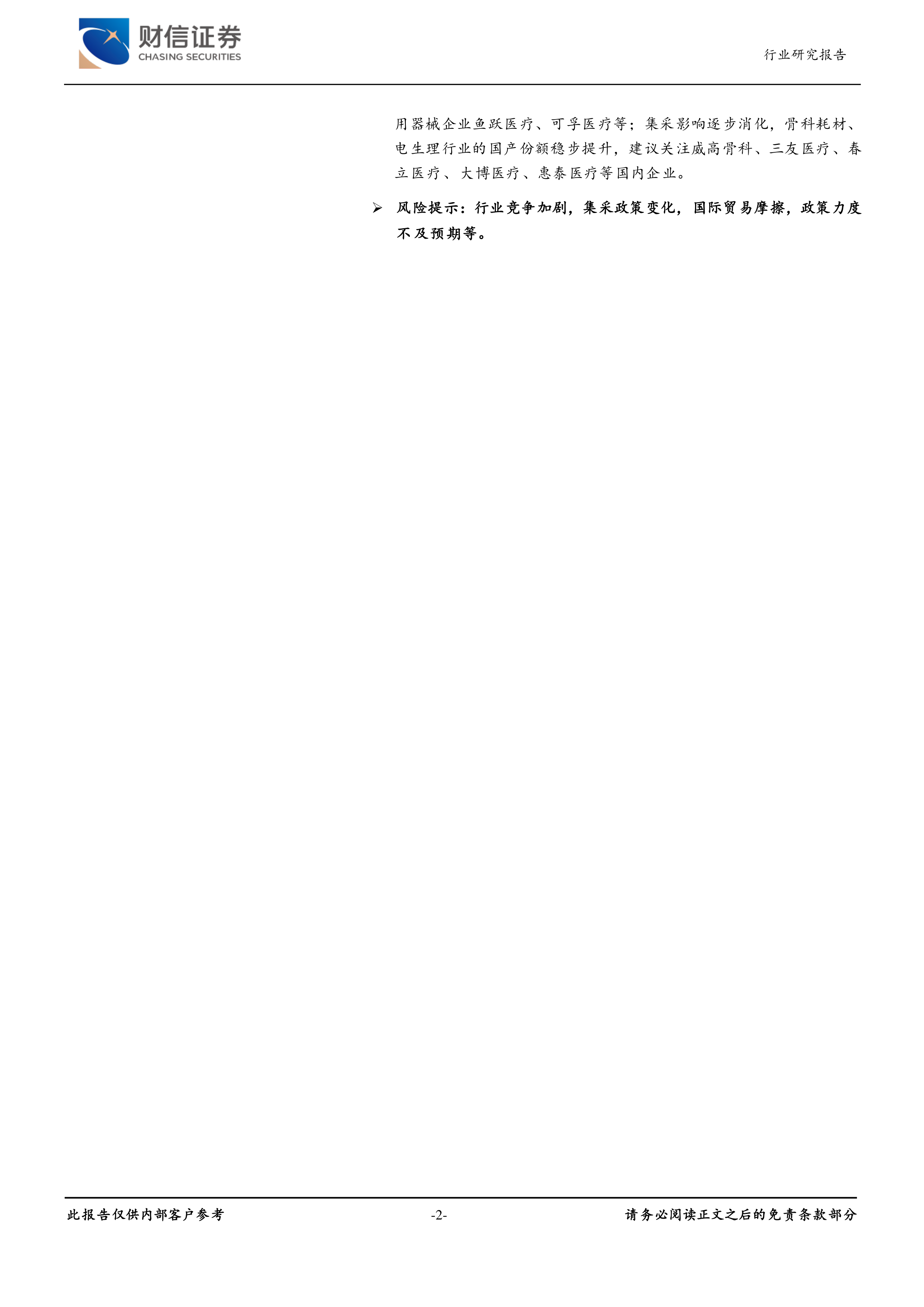 风险提示:行业竞争加剧,集采政策变化,国际贸易摩擦,政策力度不及预期等。