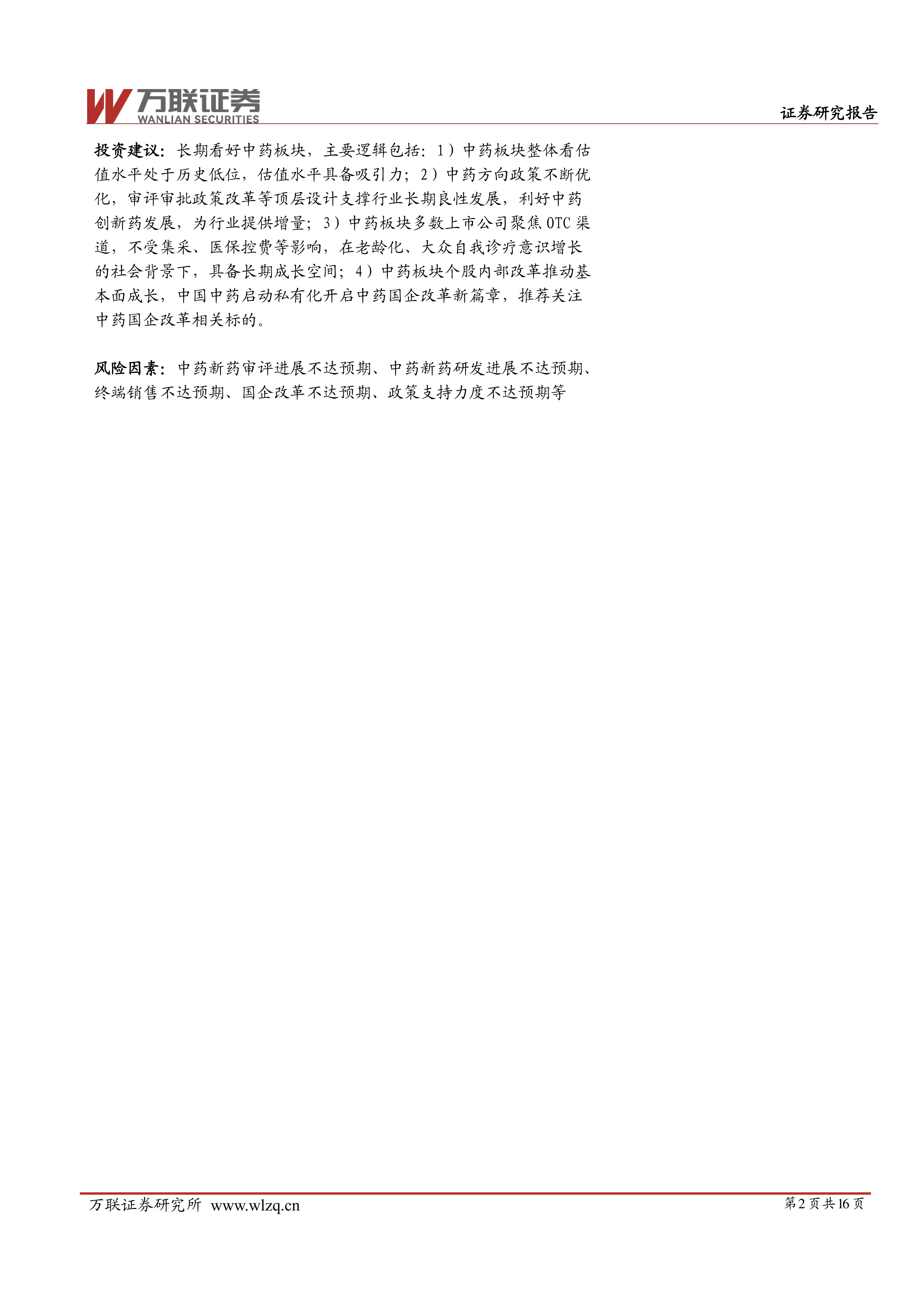 风险因素:中药新药审评进展不达预期、中药新药研发进展不达预期、终端销售不达预期、国企改革不达预期、政策支持力度不达预期等