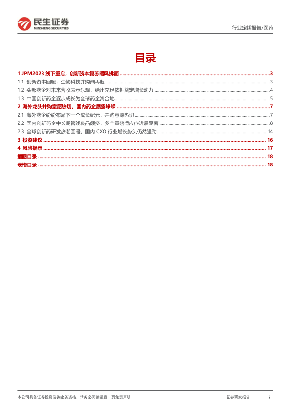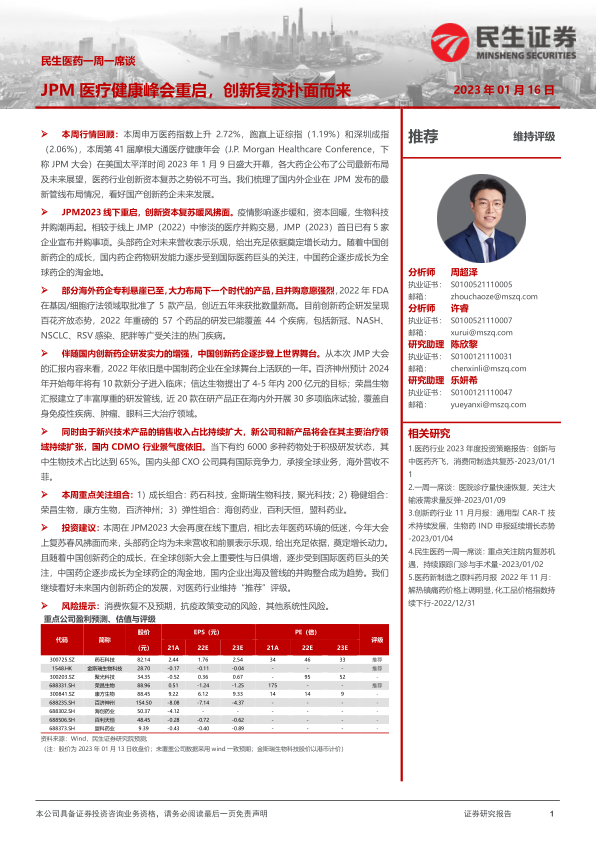 本报告的核心观点是:2023年JPM医疗健康峰会线下重启,标志着创新资本复苏,医药行业呈现积极发展态势。海外药企面临专利悬崖,积极寻求并购以布局未来;国内创新药企研发实力增强,国际影响力提升,并购整合成为趋势。民生证券维持对医药行业的“推荐”评级。
