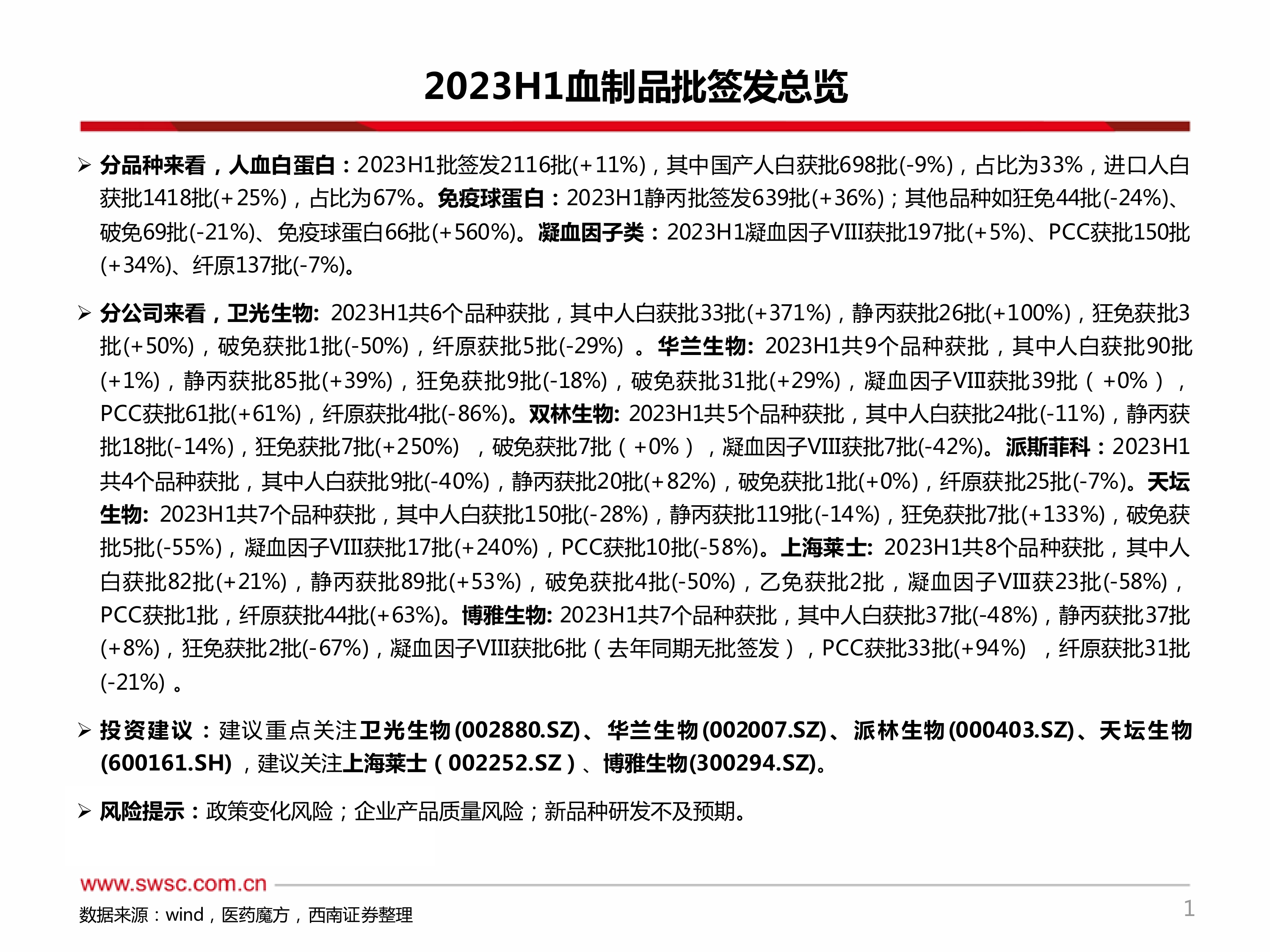 分公司来看,卫光生物:2023H1共6个品种获批,其中人白获批33批(+371%),静丙获批26批(+100%),狂免获批3批(+50%),破免获批1批(-50%),纤原获批5批(-29%)。华兰生物:2023H1共9个品种获批,其中人白获批90批(+1%),静丙获批85批(+39%),狂免获批9批(-18%),破免获批31批(+29%),凝血因子VIII获批39批(+0%),PCC获批61批(+61%),纤原获批4批(-86%)。双林生物:2023H1共5个品种获批,其中人白获批24批(-11%),静丙获批18批(-14%),狂免获批7批(+250%),破免获批7批(+0%),凝血因子VIII获批7批(-42%)。派斯菲科:2023H1共4个品种获批,其中人白获批9批(-40%),静丙获批20批(+82%),破免获批1批(+0%),纤原获批25批(-7%)。天坛生物:2023H1共7个品种获批,其中人白获批150批(-28%),静丙获批119批(-14%),狂免获批7批(+133%),破免获批5批(-55%),凝血因子VIII获批17批(+240%),PCC获批10批(-58%)。上海莱士:2023H1共8个品种获批,其中人白获批82批(+21%),静丙获批89批(+53%),破免获批4批(-50%),乙免获批2批,凝血因子VIII获23批(-58%),PCC获批1批,纤原获批44批(+63%)。博雅生物:2023H1共7个品种获批,其中人白获批37批(-48%),静丙获批37批(+8%),狂免获批2批(-67%),凝血因子VIII获批6批(去年同期无批签发),PCC获批33批(+94%),纤原获批31批(-21%)。