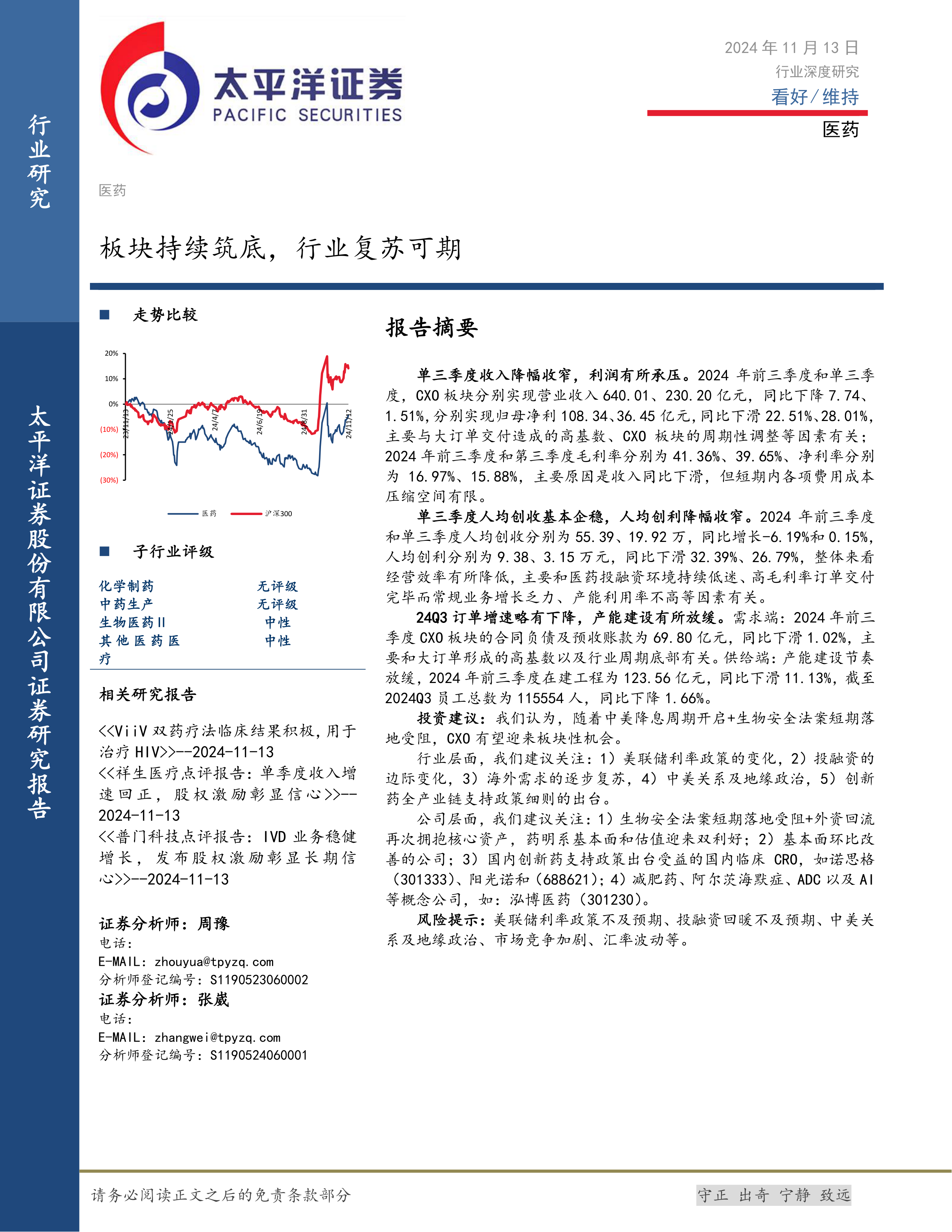 CXO板块经历了阶段性调整,但2024年三季度收入降幅已收窄,利润承压有所缓解,预示着行业触底回升的趋势。
