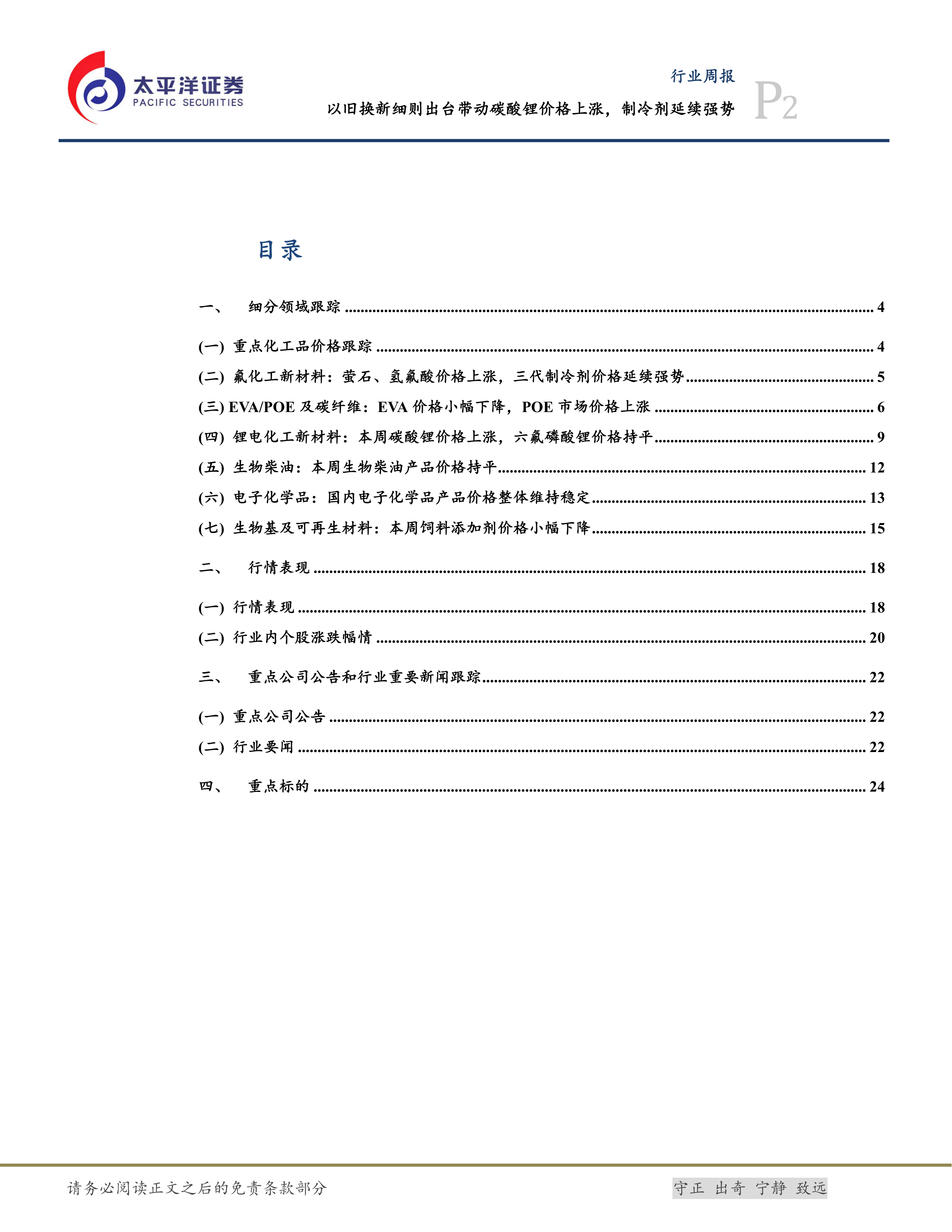本报告的核心观点是:汽车以旧换新补贴细则的出台以及空调市场需求的增长,分别推动了锂电材料(碳酸锂)和氟化工新材料(制冷剂)价格上涨。报告同时对其他化工新材料细分领域的市场行情进行了跟踪分析,并对重点公司和行业新闻进行了梳理。