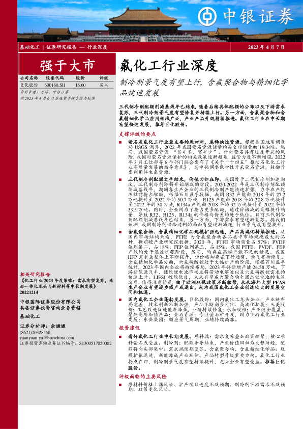 三代制冷剂配额削减基线年已结束,随着后续具体配额的公布以及下游需求复苏, 三代制冷剂景气度有望修复并持续上行。 另一方面, 含氟聚合物和含氟精细化学品应用领域广泛,产业产品升级持续推进。 氟化工行业在中长期有望快速发展,推荐巨化股份。