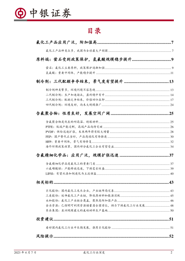 本报告通过对氟化工行业原料、制冷剂、含氟聚合物和含氟精细化学品等多个细分市场的深入分析,以及对相关上市公司的全面评估,得出氟化工行业正处于景气度提升的拐点,龙头企业将受益于行业发展。 报告推荐巨化股份作为投资标的,并对投资风险进行了提示。 报告的数据和分析为投资者提供了对氟化工行业未来发展趋势的参考,但投资者仍需根据自身情况进行独立判断。