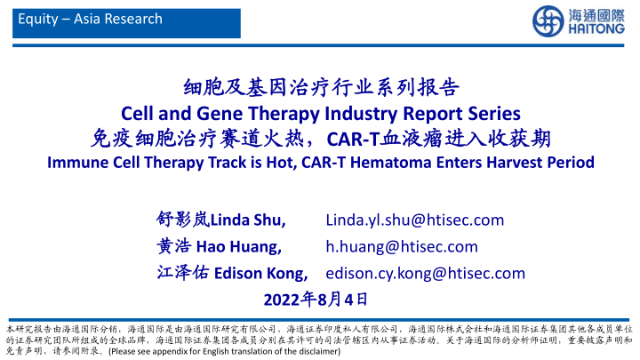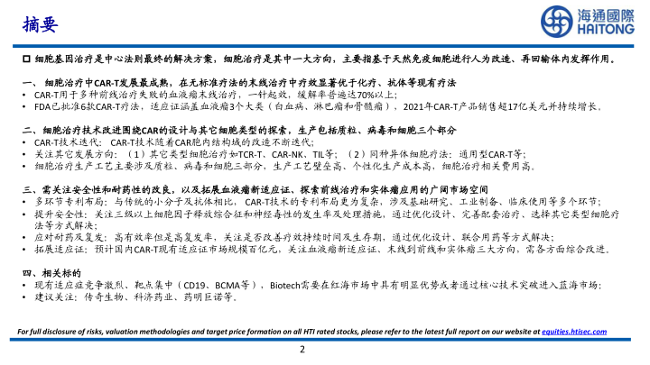 本报告主要从以下几个方面对细胞及基因治疗行业,特别是免疫细胞治疗赛道进行了分析: