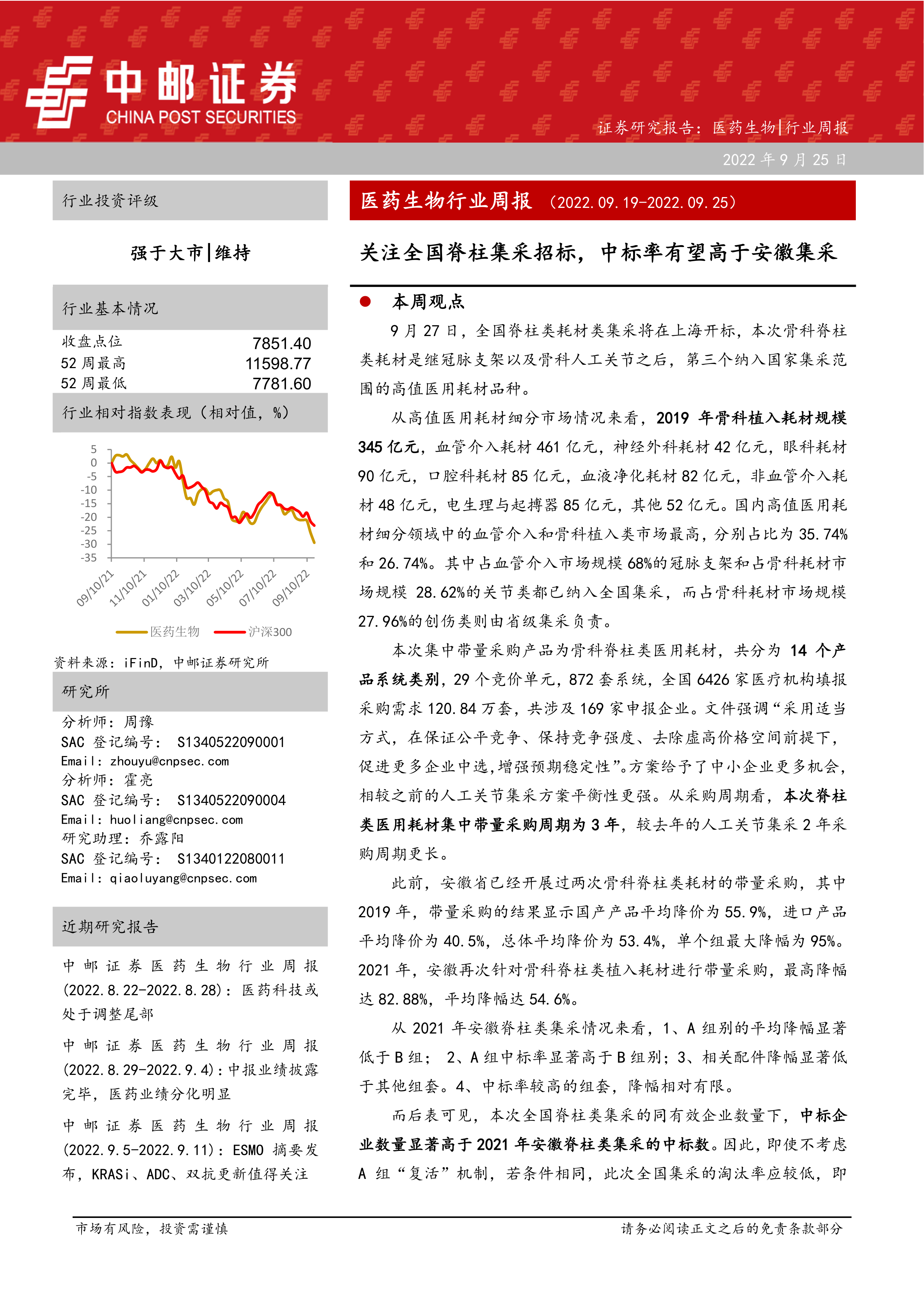 医药生物行业周报:关注全国脊柱集采招标,中标率有望高于安徽集采