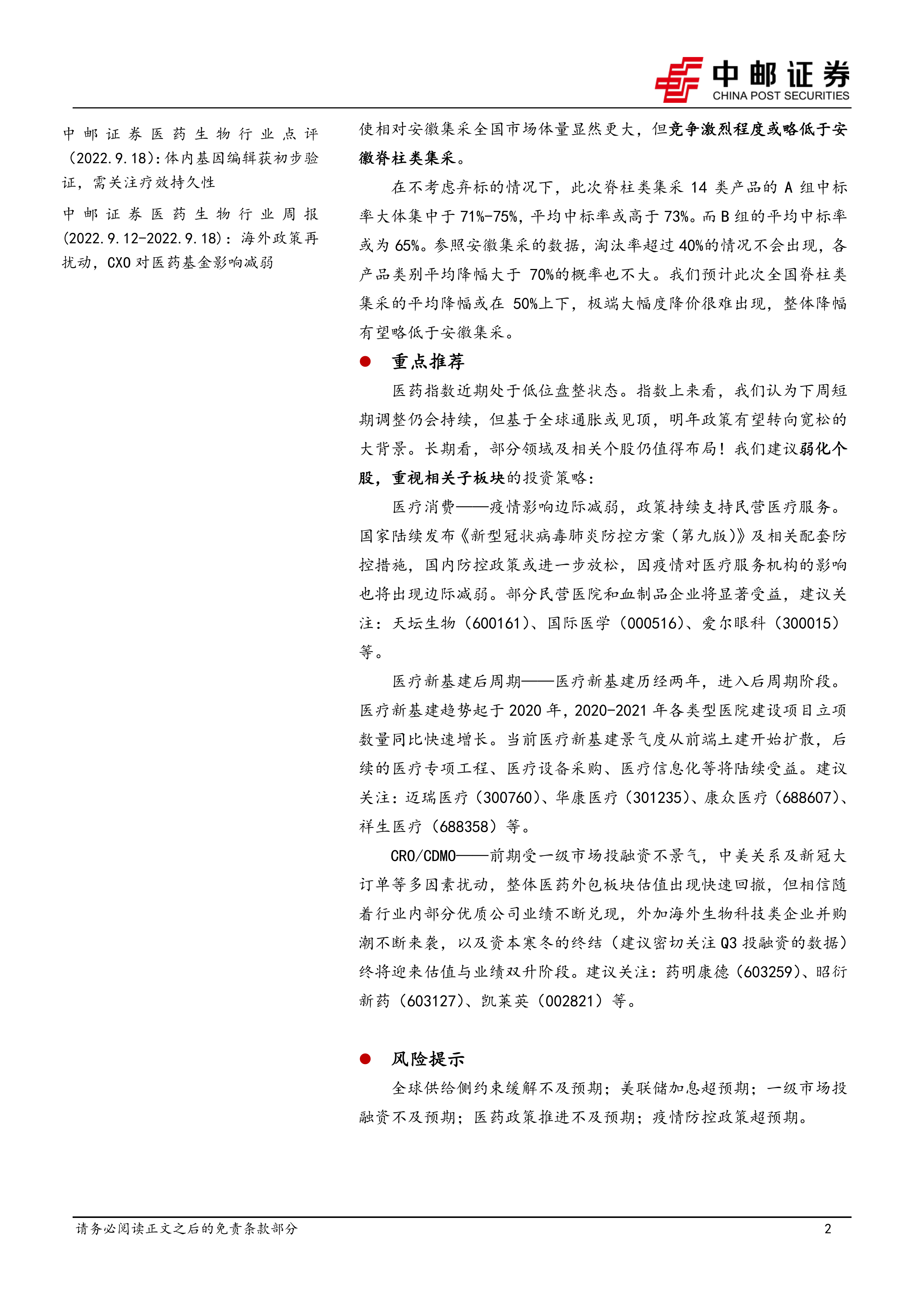 本报告的核心观点是:即将进行的全国脊柱类耗材集采,在参考安徽省此前两次集采经验的基础上,预计平均降幅会在50%左右,极端大幅降价的可能性较小,整体降幅有望略低于安徽集采。同时,报告推荐了在当前市场环境下值得关注的医药子板块及相关个股,并提示了潜在的投资风险。