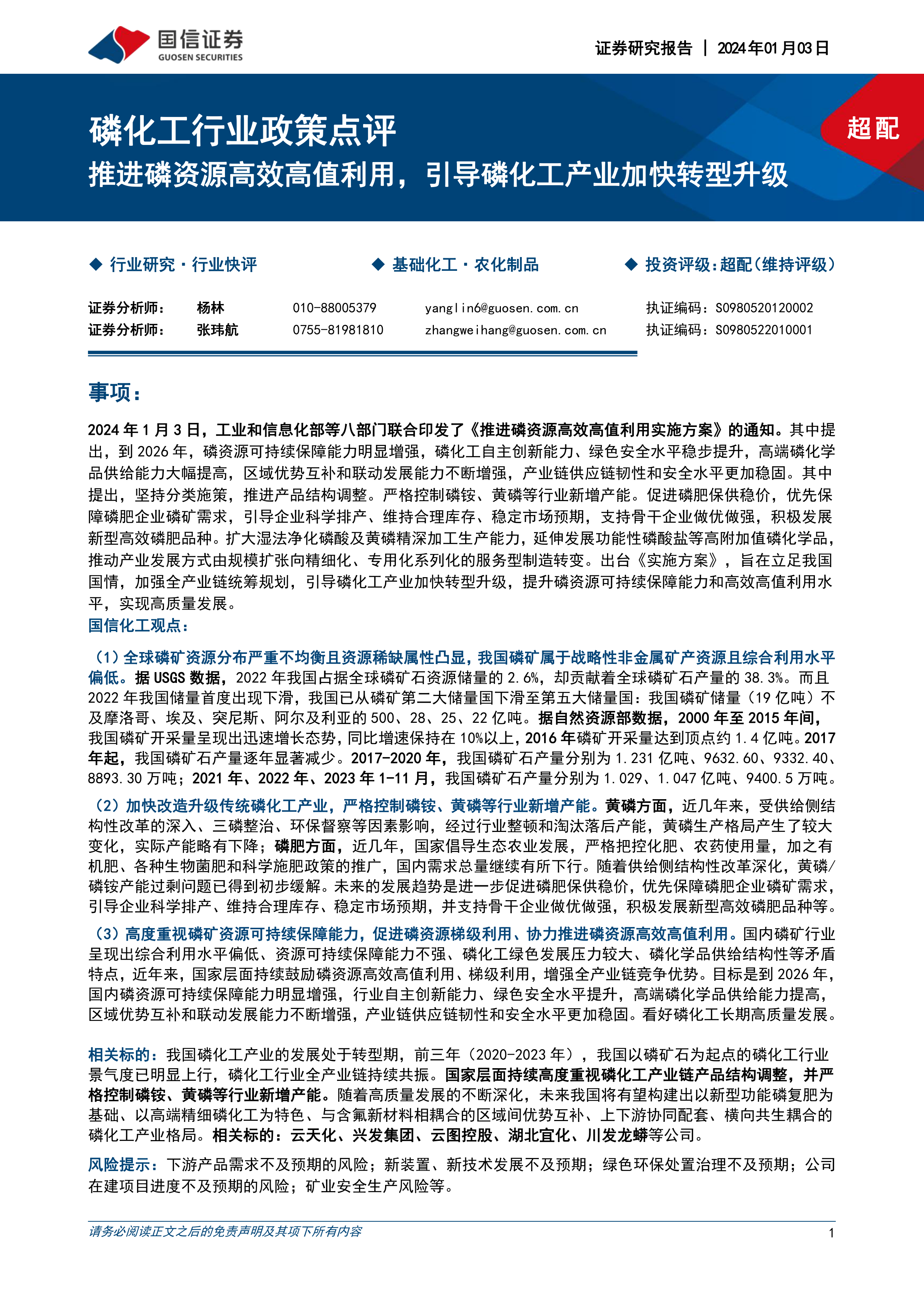 报告最后推荐了云天化、兴发集团、云图控股、湖北宜化、川发龙蟒等磷化工相关上市公司,并给出了“超配”的投资评级。