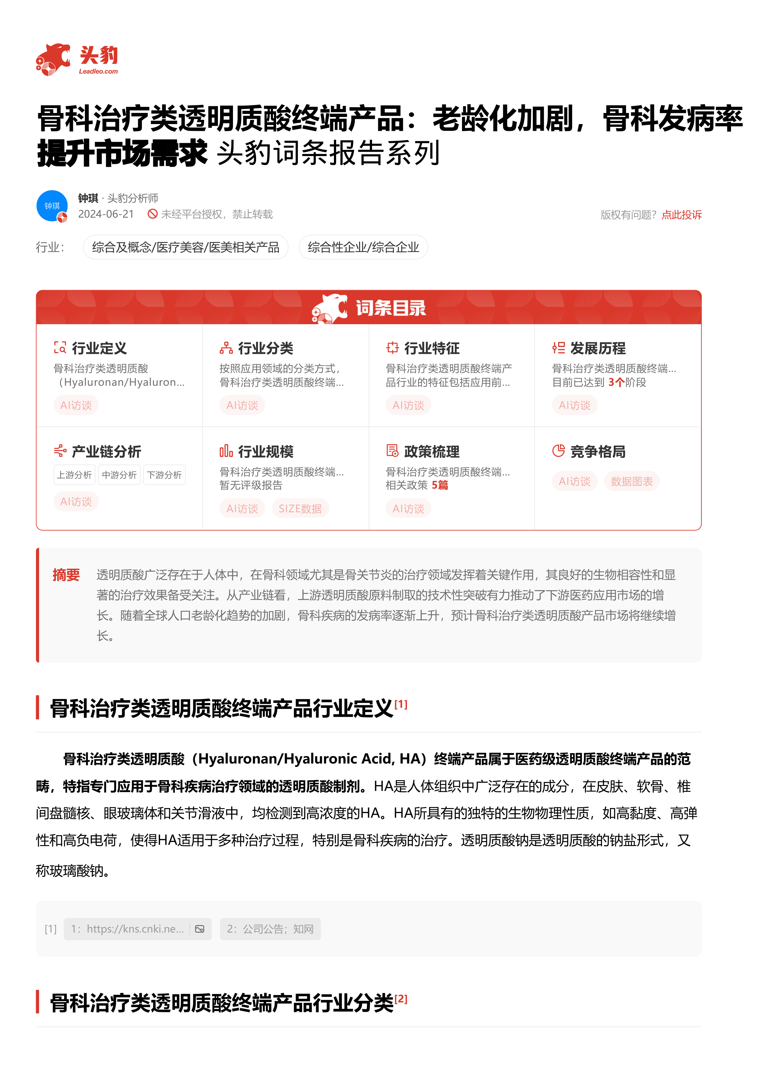 骨科治疗类透明质酸终端产品:老龄化加剧,骨科发病率提升市场需求 头豹词条报告系列