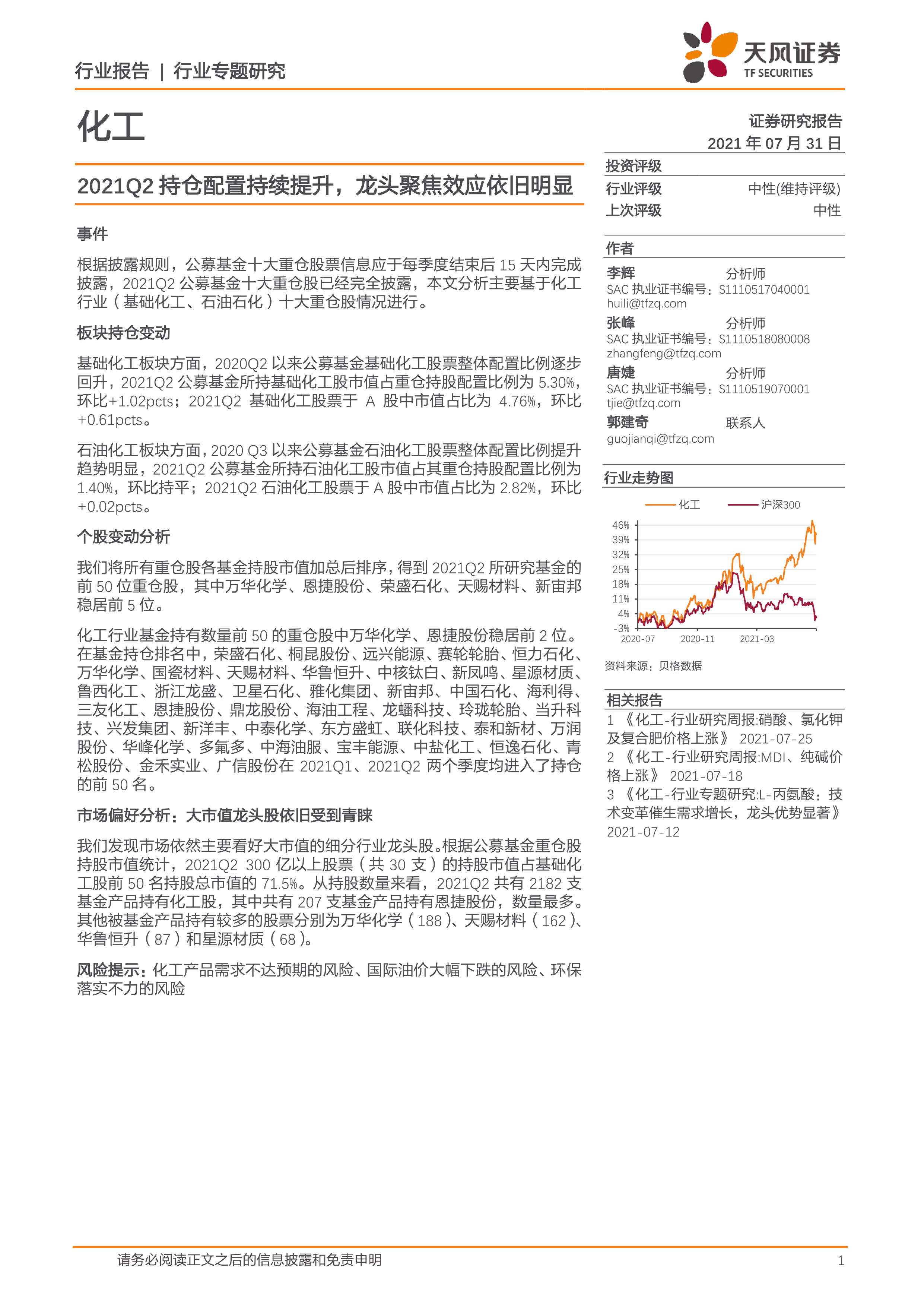 化工行业专题研究:2021Q2持仓配置持续提升,龙头聚焦效应依旧明显