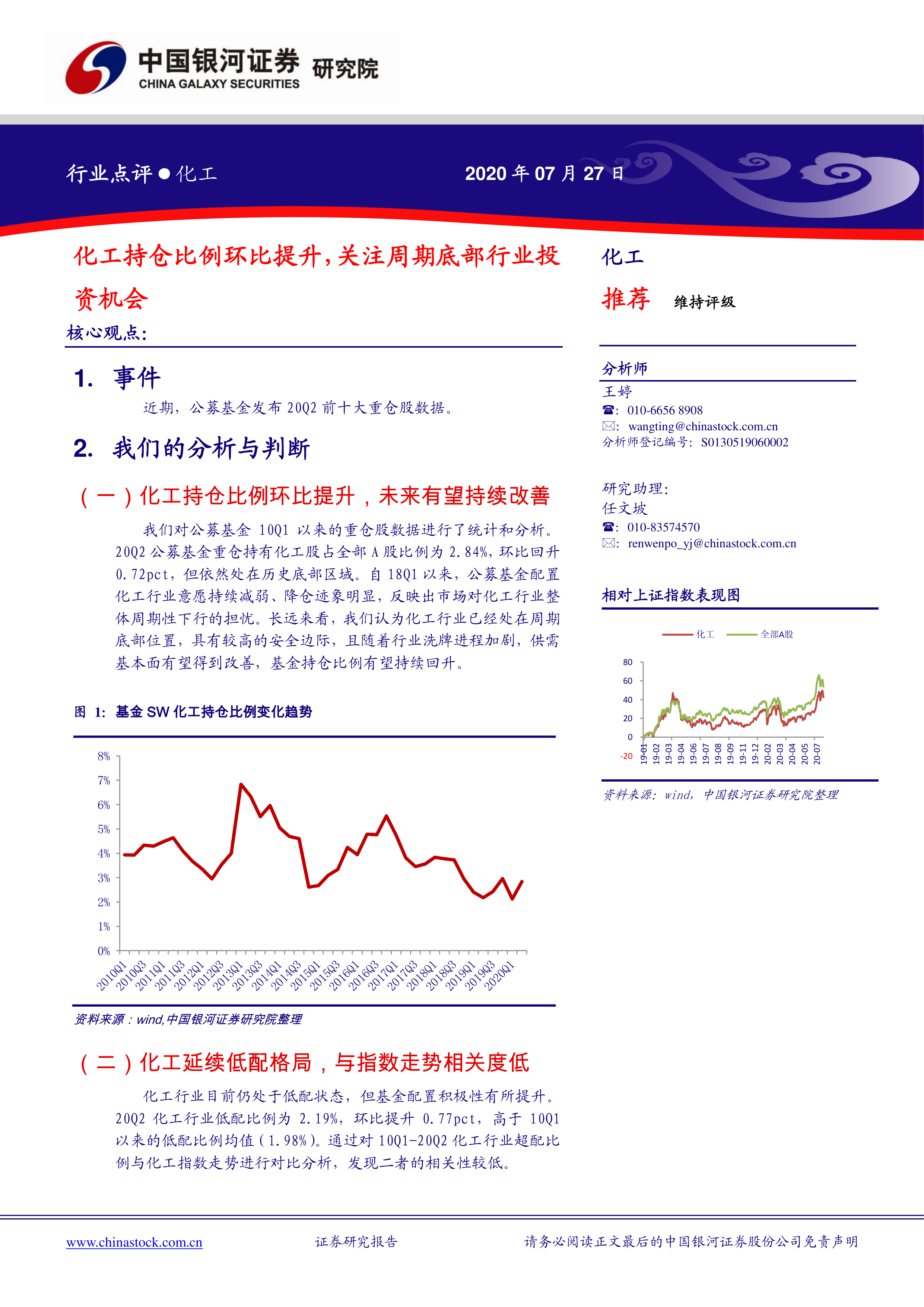 本报告的核心观点是:2020年第二季度,公募基金对化工行业的持仓比例环比上升,但仍处于历史低位,行业整体仍处于低配状态。尽管化工指数与基金配置积极性相关性较低,但细分领域龙头企业加仓明显,显示出市场对化工行业周期底部反转的预期。报告建议关注石油加工和周期底部细分领域(如纯碱、甲醇)的投资机会。