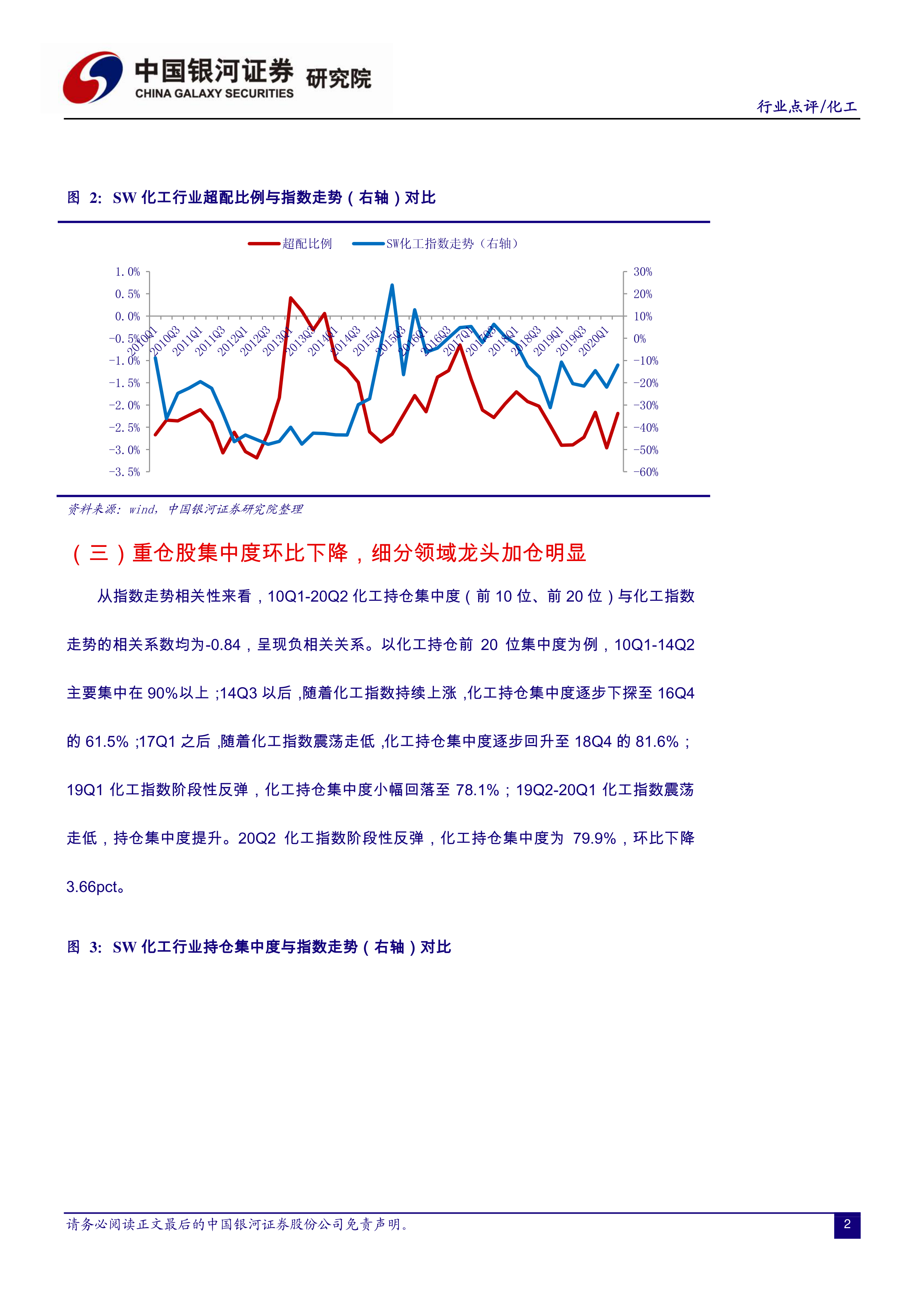 本部分分析了公募基金2020年第二季度化工行业持仓比例的环比提升,并结合历史数据,指出该比例虽然上升,但仍处于历史低位,未来有望持续改善。图表1显示了基金SW化工持仓比例变化趋势,图表2显示了SW化工行业超配比例与指数走势对比。