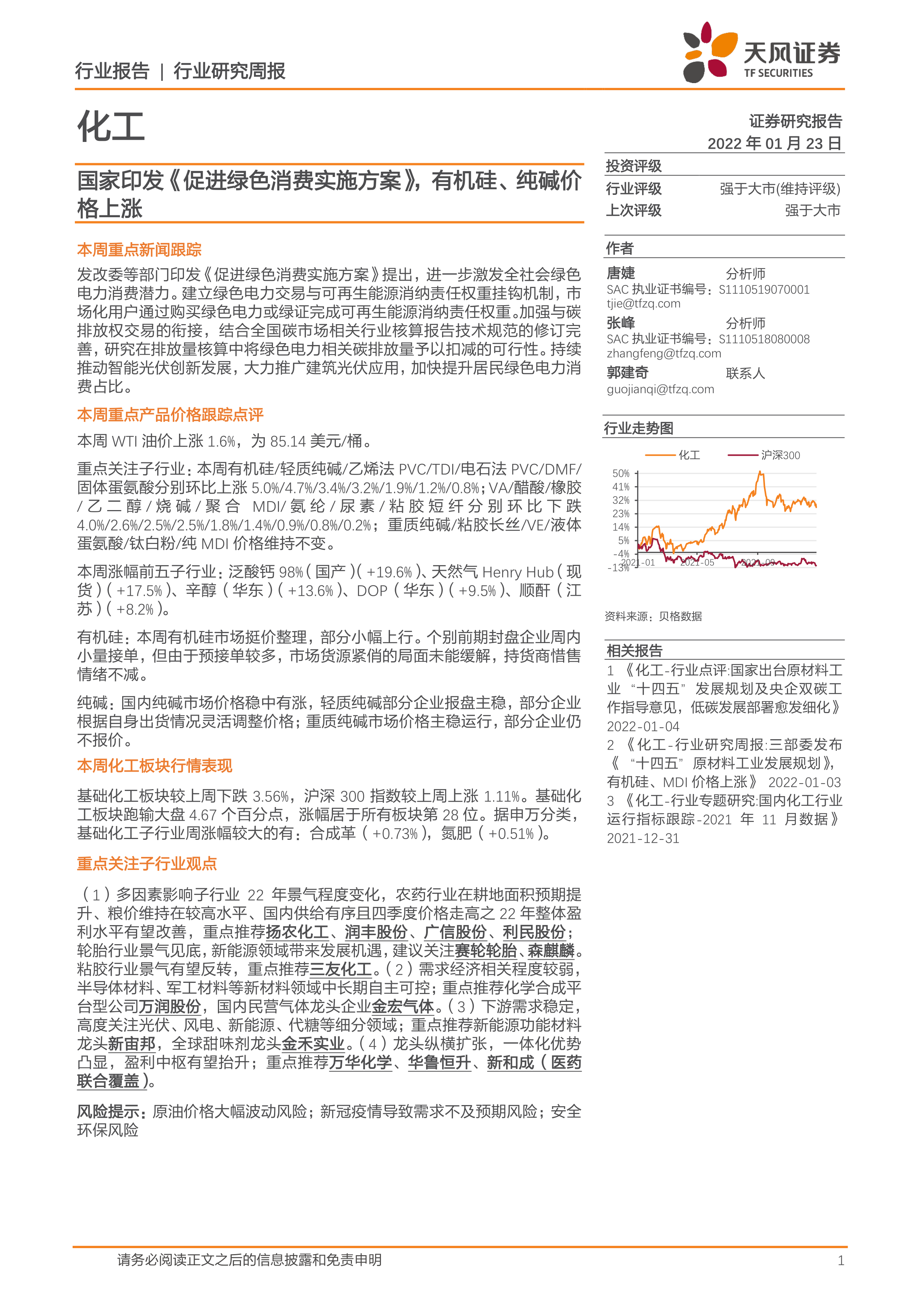 本报告的核心观点是:基于国家政策导向和市场数据分析,中国化工行业在2022年1月23日呈现出分化态势。部分子行业,如有机硅和轻质纯碱,价格上涨,显示出较强的市场活力;而另一些子行业,例如VA和乙二醇,价格下跌,面临一定挑战。整体而言,化工板块跑输大盘,但部分细分领域仍具备投资机会,需谨慎评估风险。