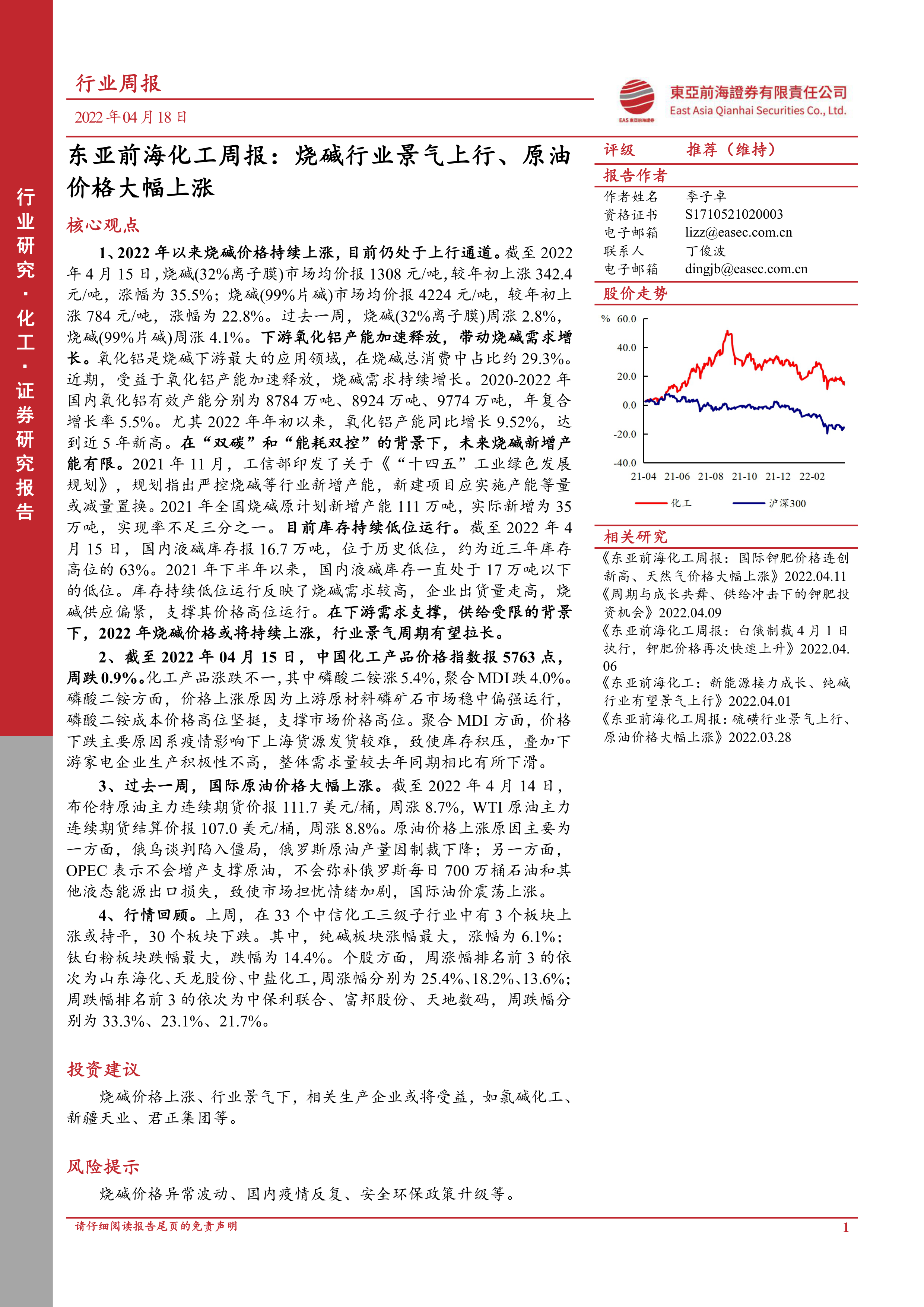 本报告分析了2022年4月11日至15日一周内化工行业的市场表现。烧碱行业由于下游需求增长和供给端受限,价格持续上涨,行业景气度上行。国际原油价格大幅上涨,而国内化工产品价格涨跌不一,部分产品受疫情和下游需求影响出现价格下跌。报告最后给出了投资建议和风险提示,建议关注烧碱行业相关上市公司,同时需注意烧碱价格波动、疫情反复和环保政策升级等风险。 报告中提供的详细数据和图表,为投资者提供了全面的市场信息和分析,有助于投资者做出更明智的投资决策。